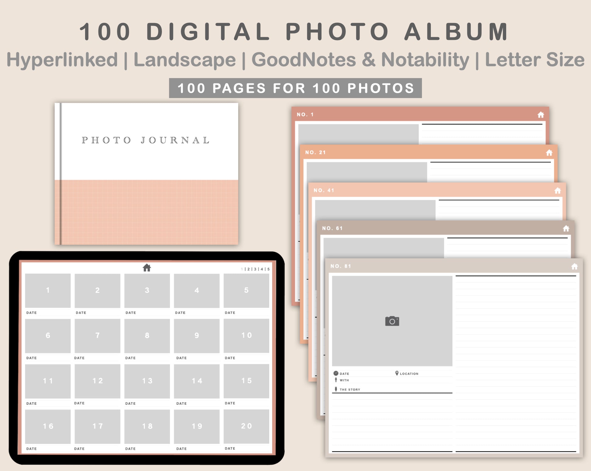 This 100 Digital Photo Album is made in NEUTRAL theme to help you keep your memory in one place. It is designed in landscape orientation (Horizontal) for pdf-annotating apps like Goodnotes 5, Noteshelf, Notability, Xodo, and others.