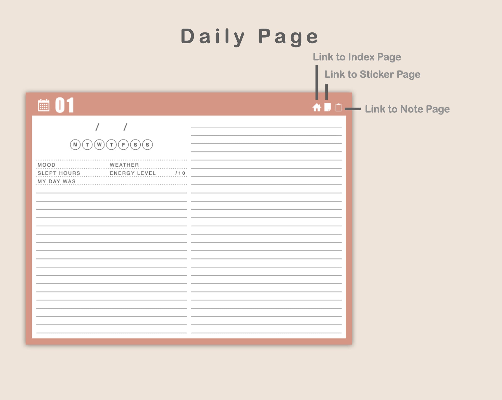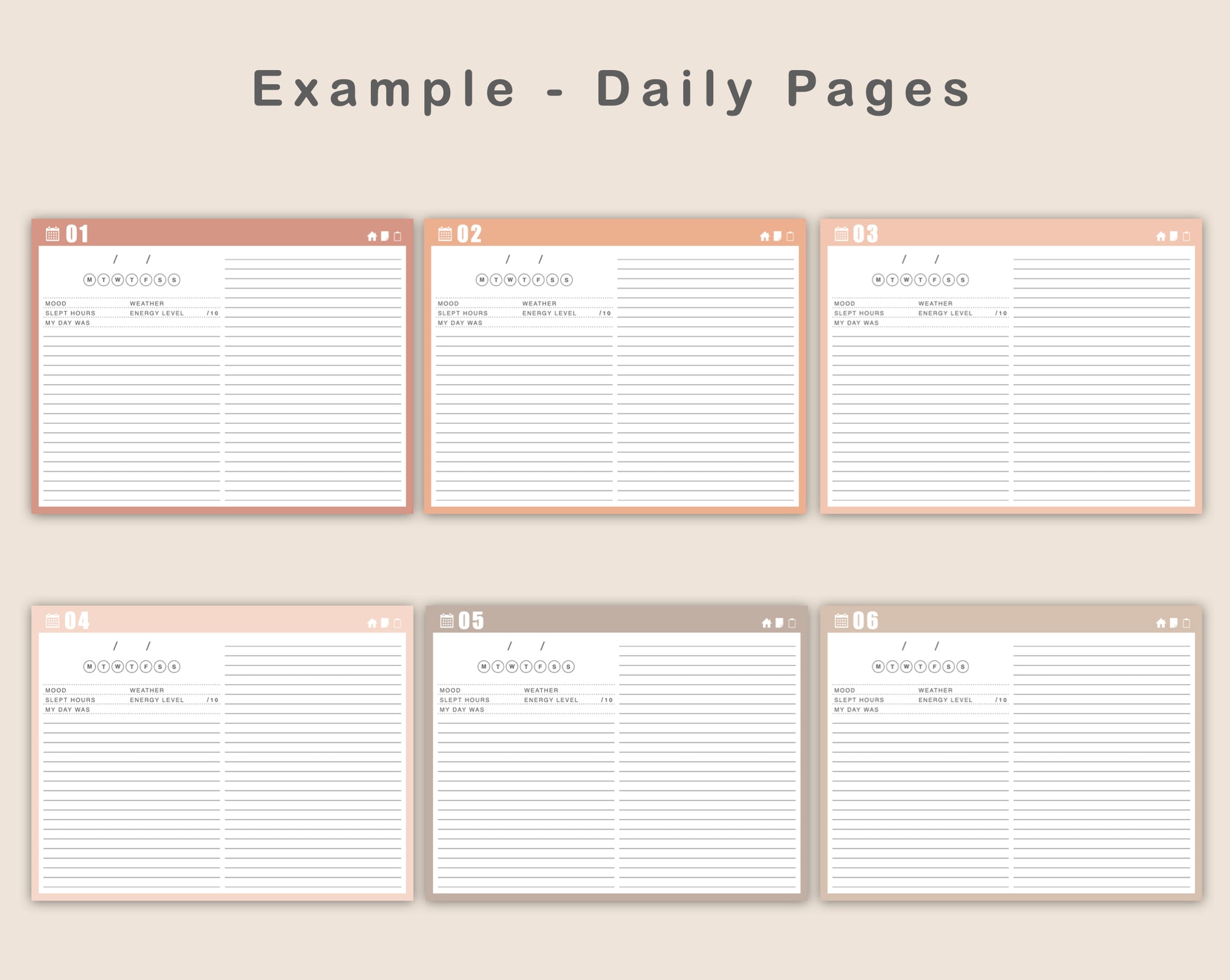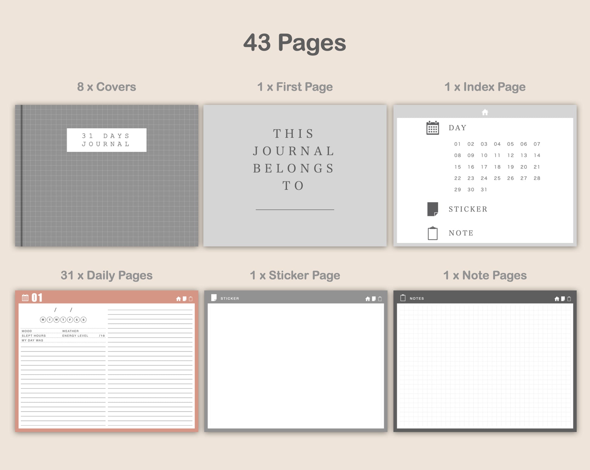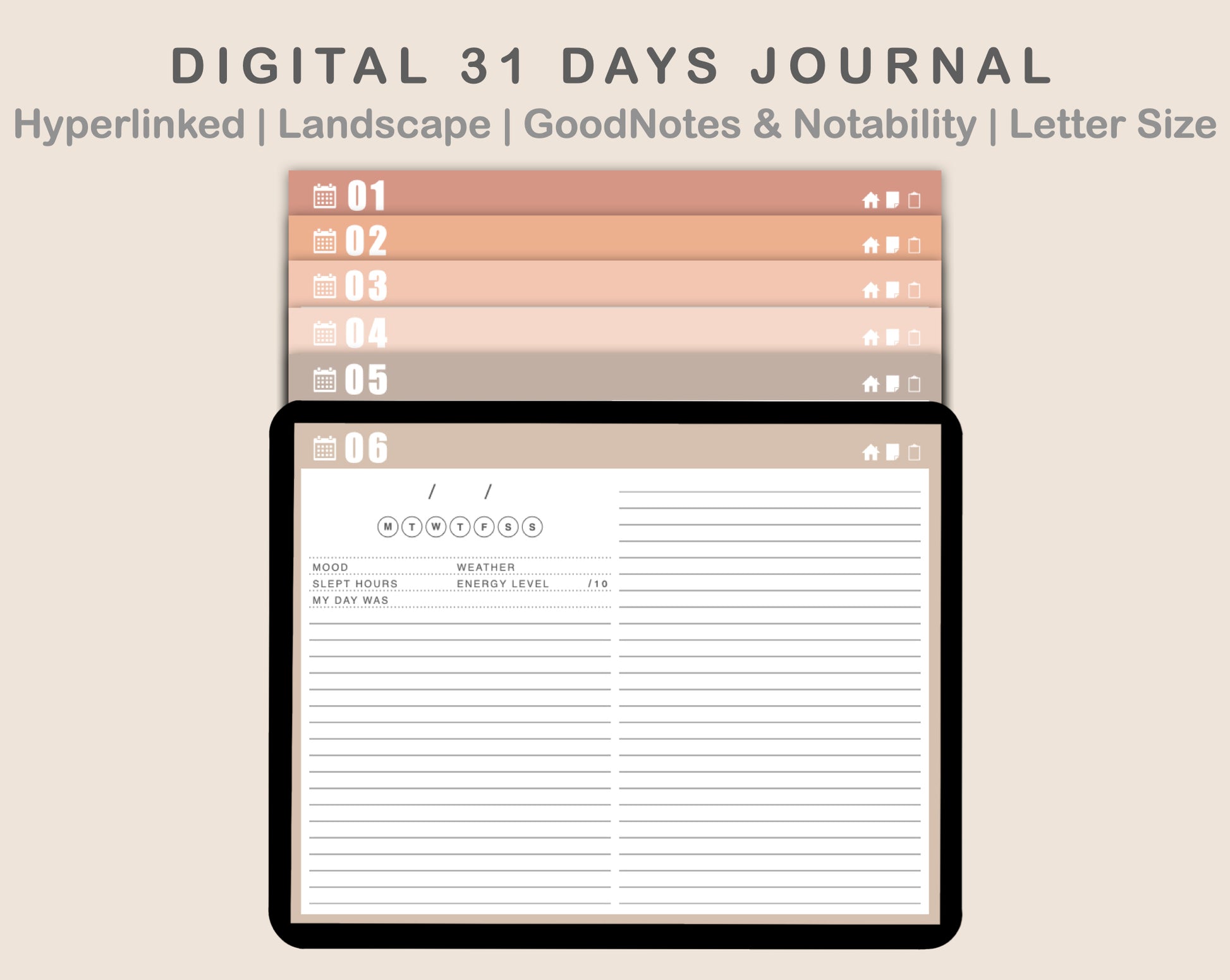 This Daily Journal, 31 Day Journal in NEUTRAL theme is made to record your daily emotions and activities. It is designed in landscape orientation for pdf-annotating apps like Goodnotes 5, Noteshelf, Notability, Xodo, and others.