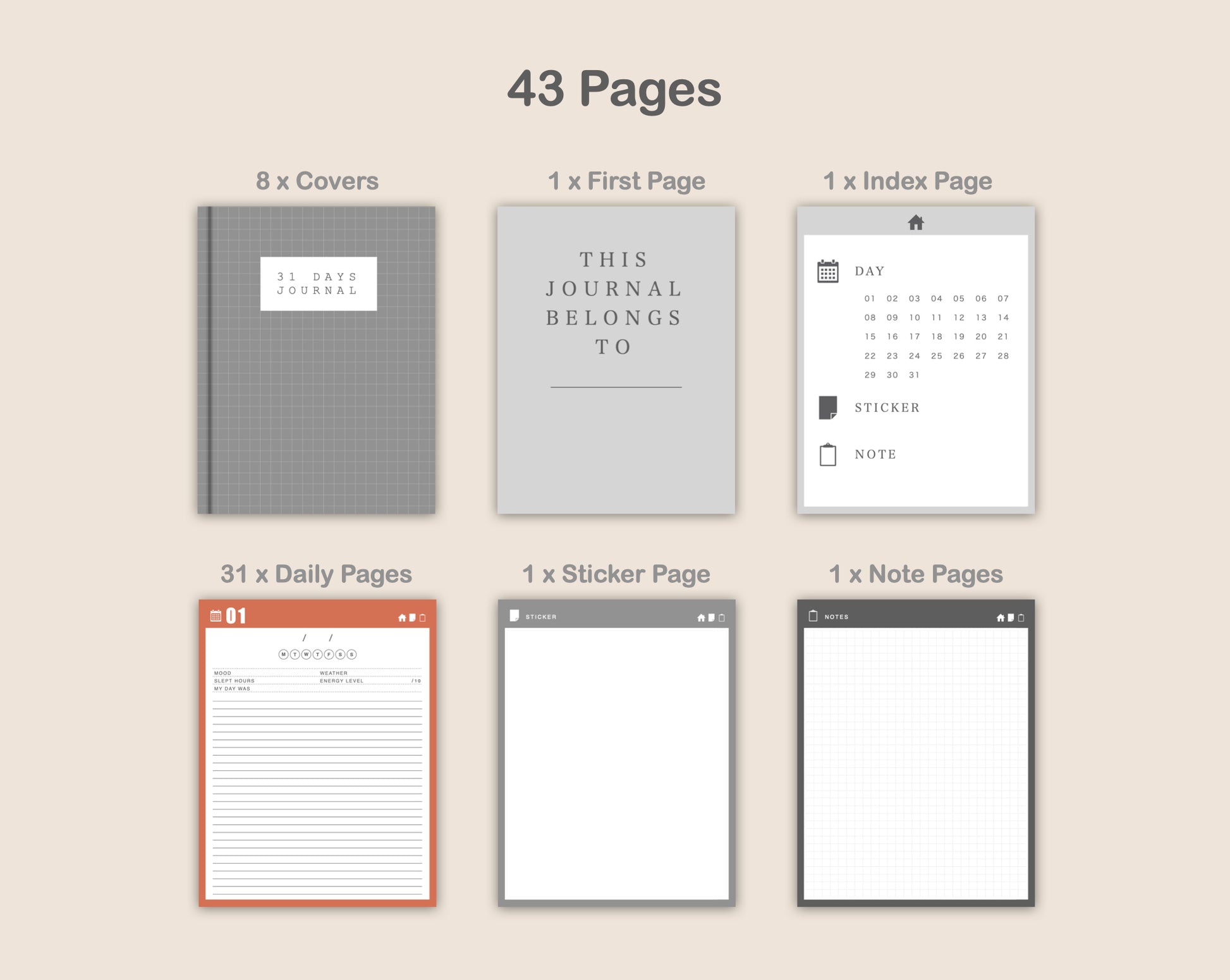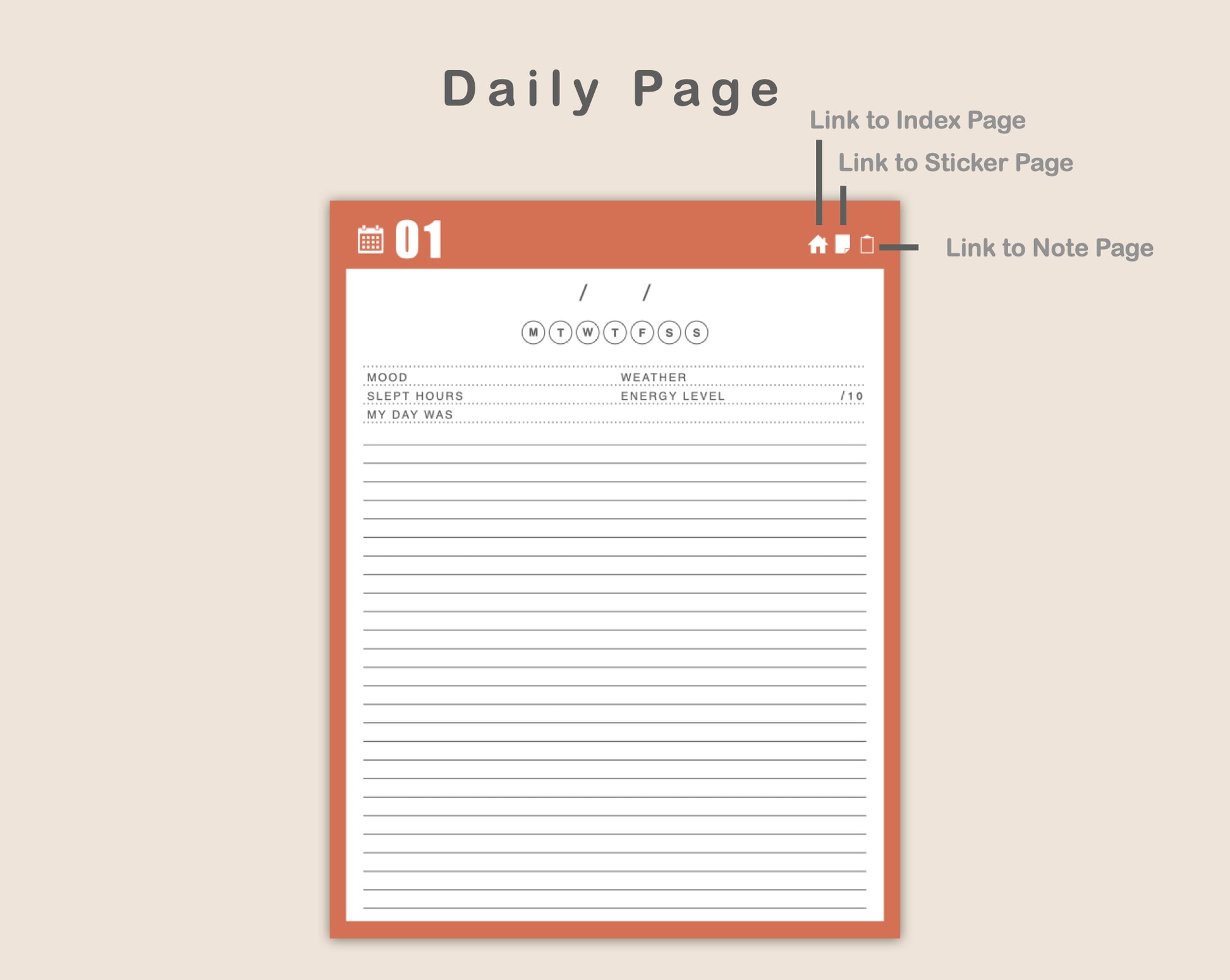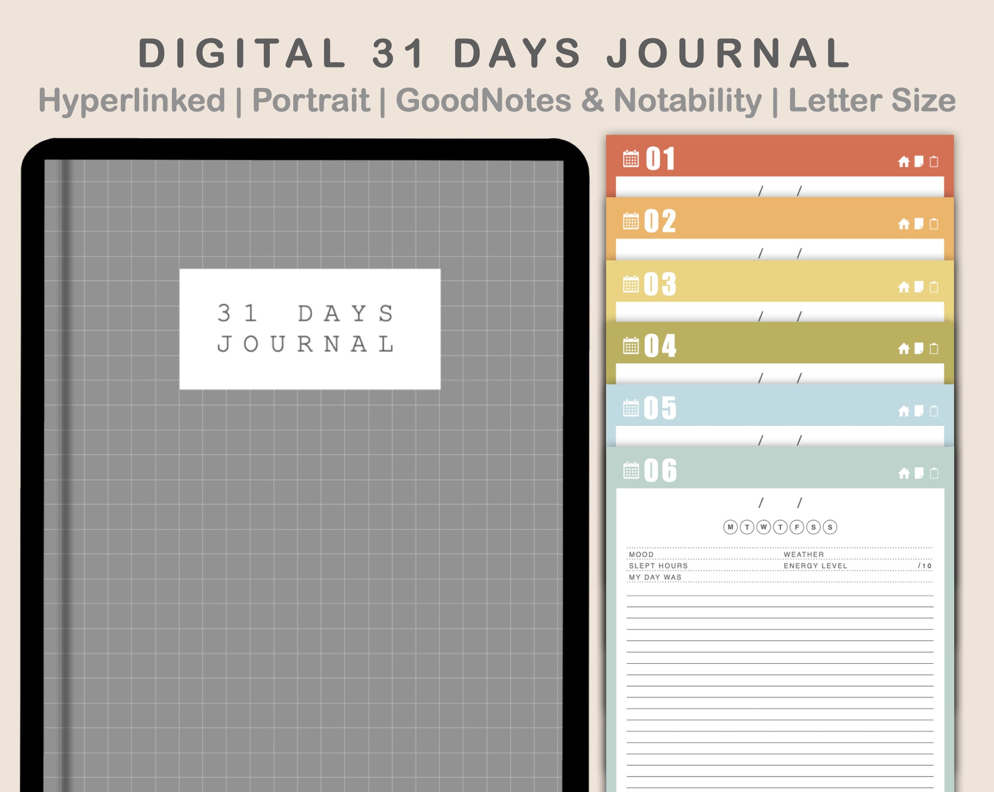 This Daily Journal, 31 Day Journal in AUTUMN theme is made to record your daily emotions and activities. It is designed in portrait orientation for pdf-annotating apps like Goodnotes 5, Noteshelf, Notability, Xodo, and others.