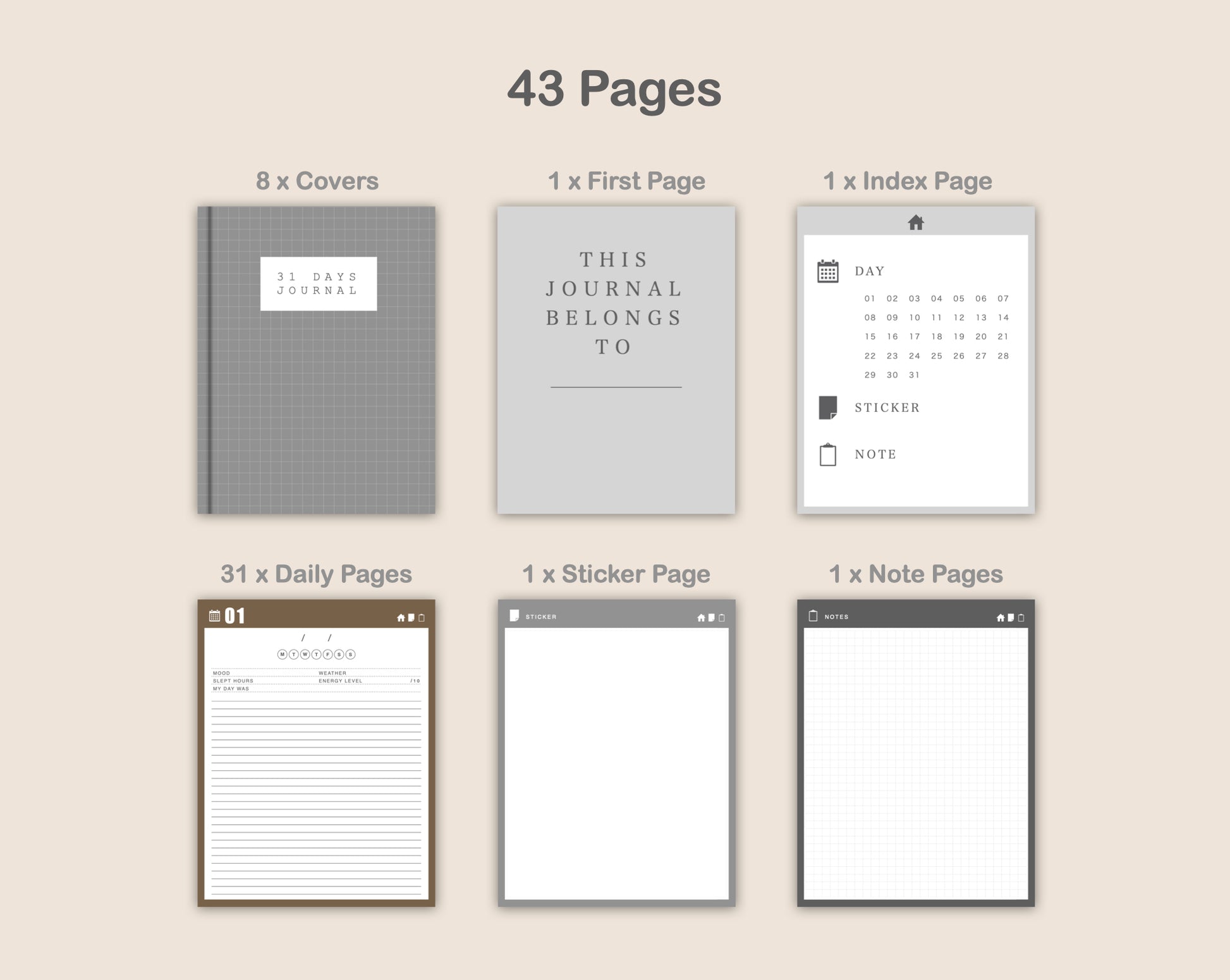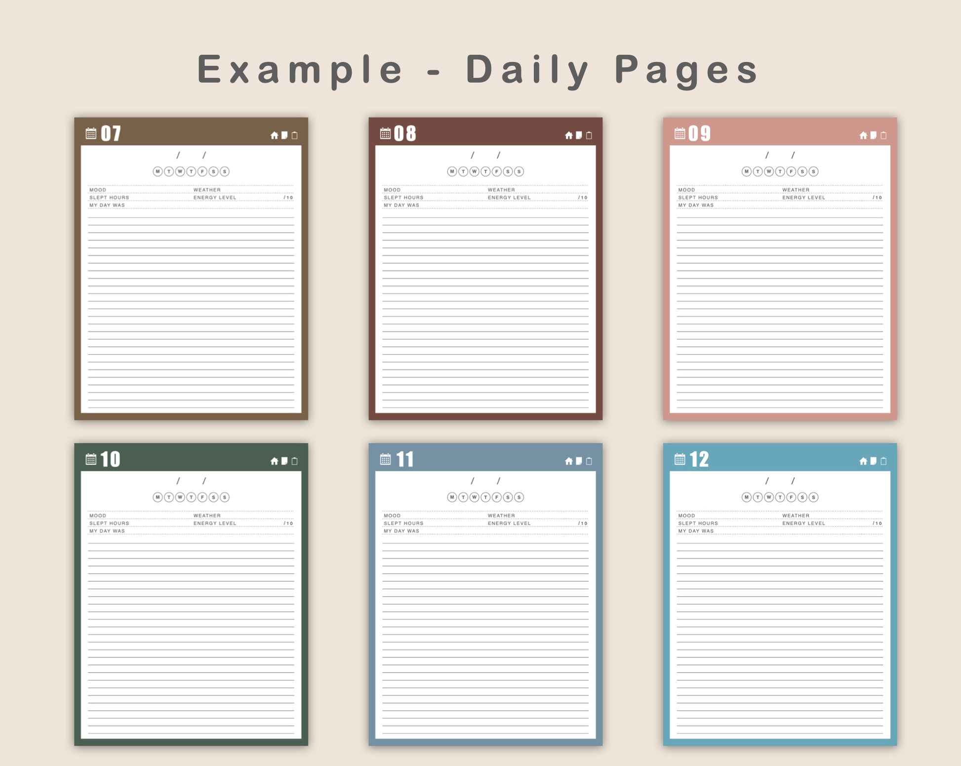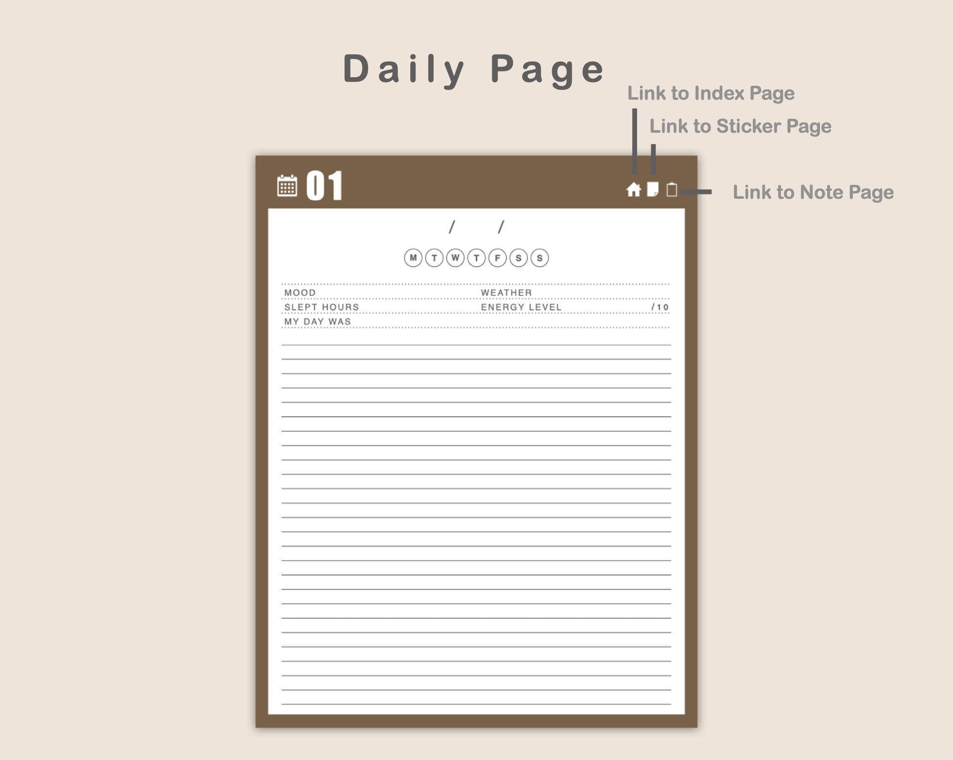 This Daily Journal, 31 Day Journal in MUTED theme is made to record your daily emotions and activities. It is designed in portrait orientation for pdf-annotating apps like Goodnotes 5, Noteshelf, Notability, Xodo, and others.