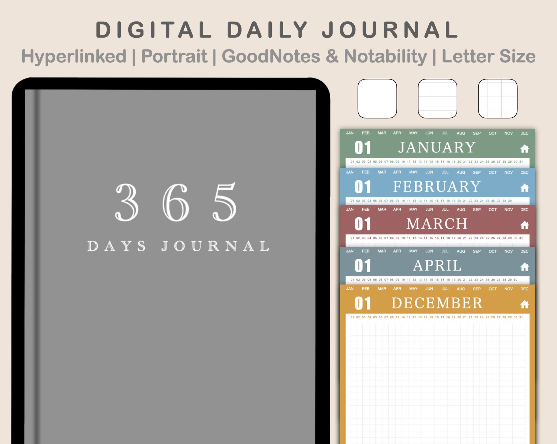 This 365 Day Journal in minimal BOHO theme is made to record your memorable events, feelings and thoughts throughout the year. It is designed in portrait orientation for pdf-annotating apps like Goodnotes 5, Noteshelf, Notability, Xodo, and others.