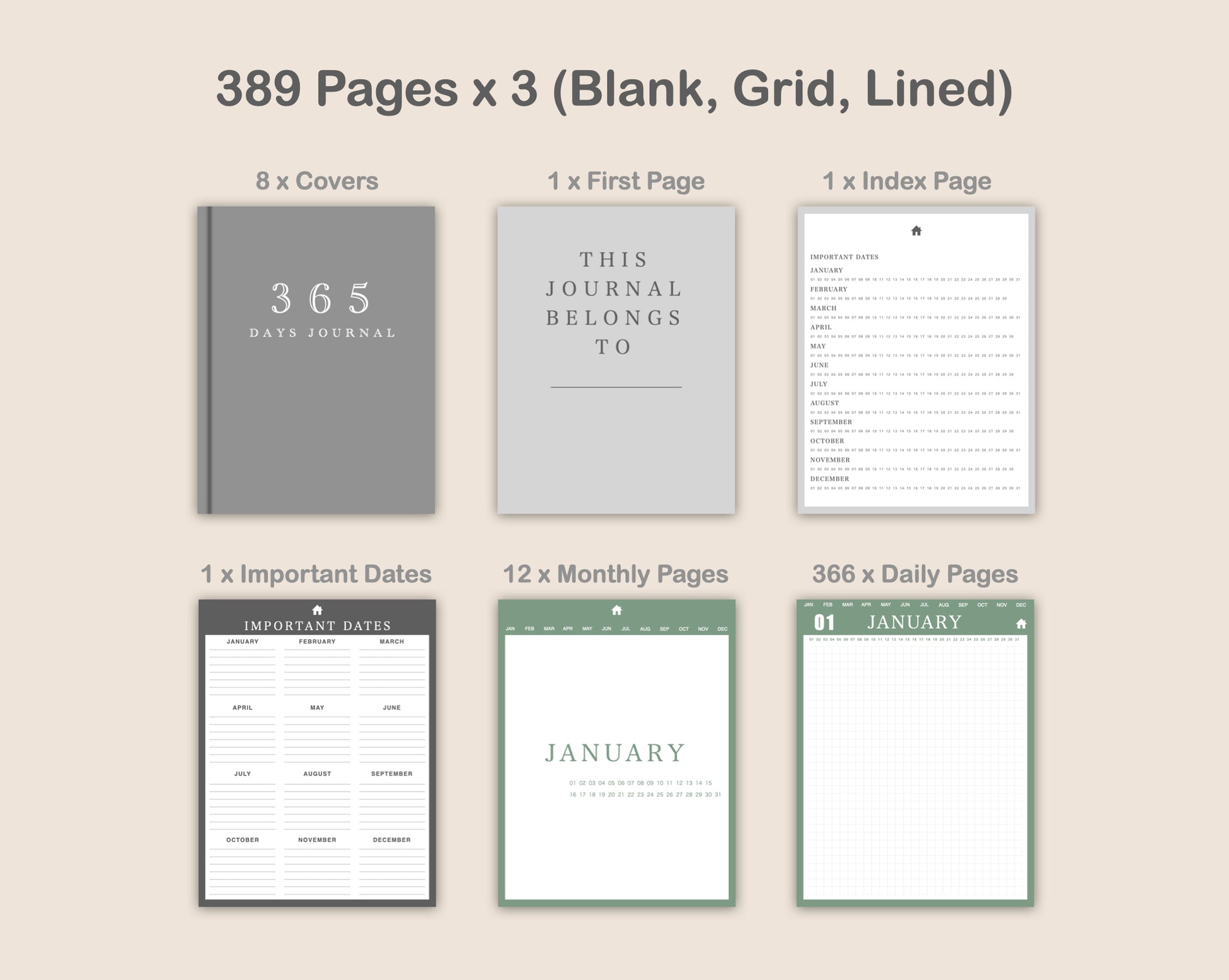 *** You will receive 3 PDF files (Blank, Lined, Grid). Each file has 389 Pages. ***