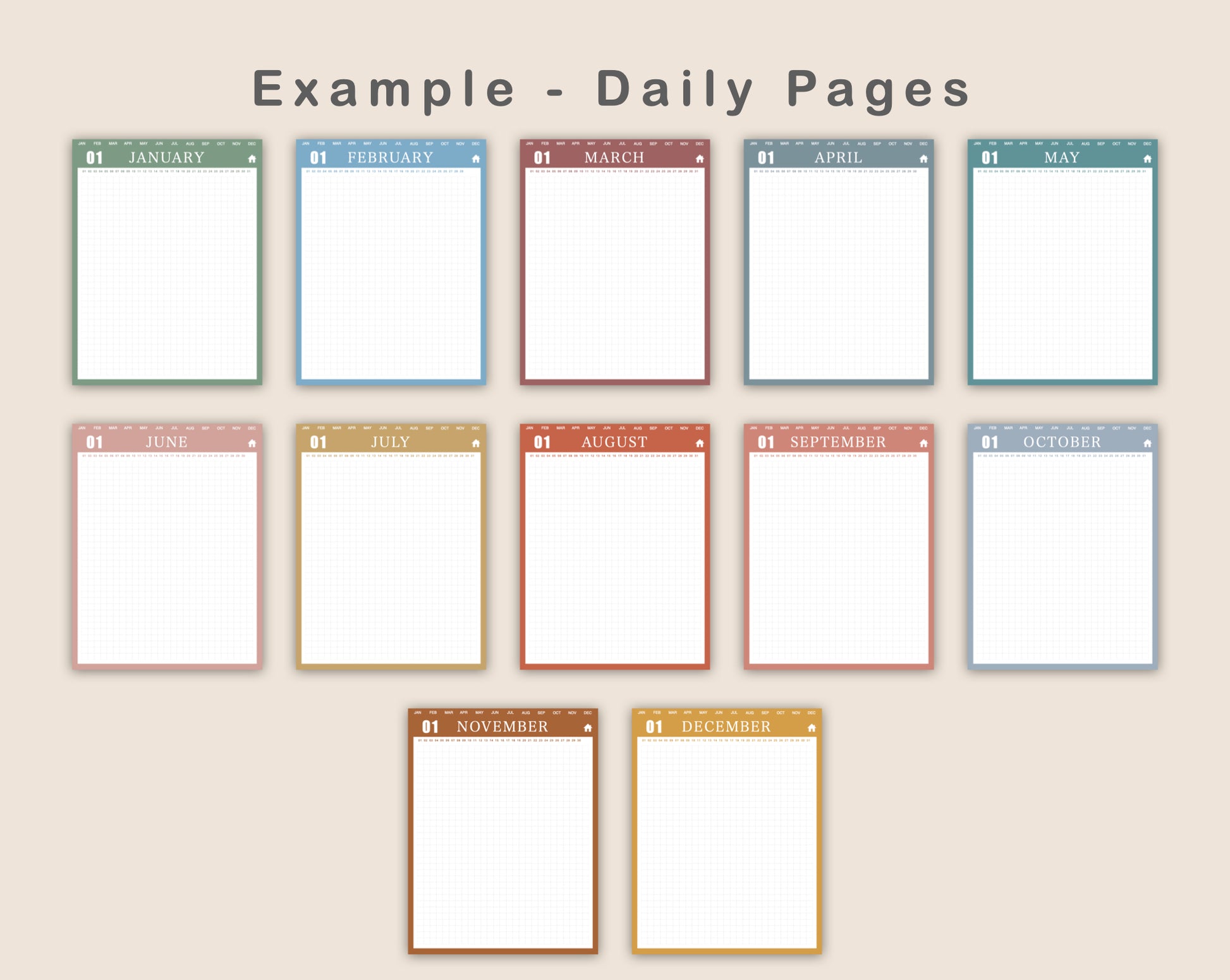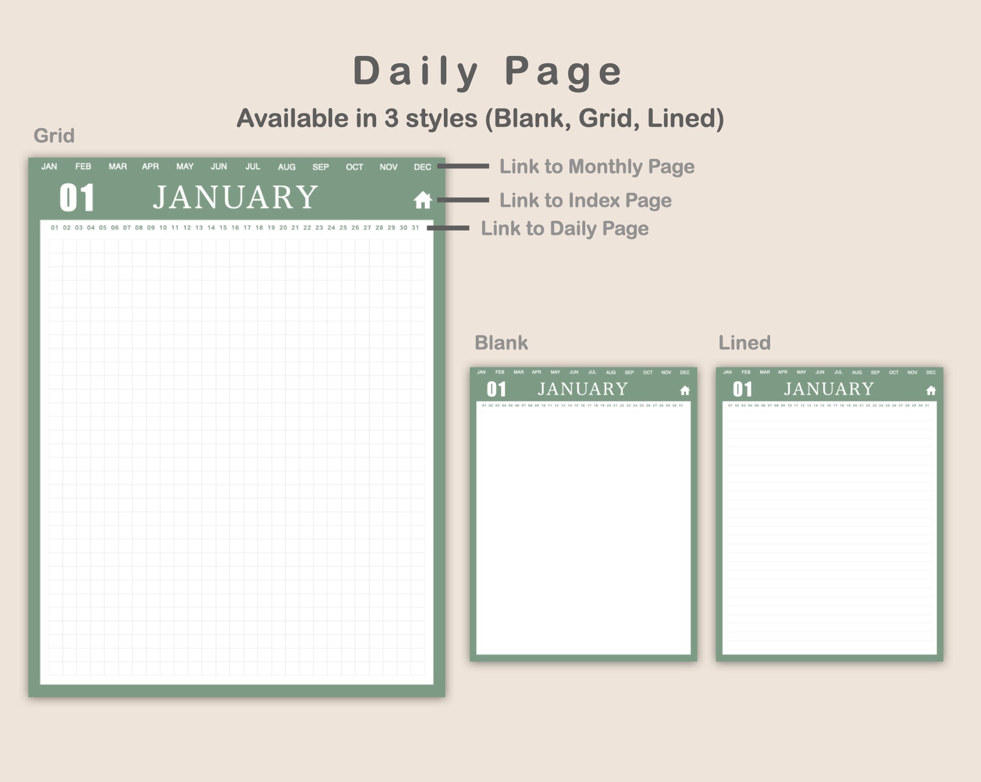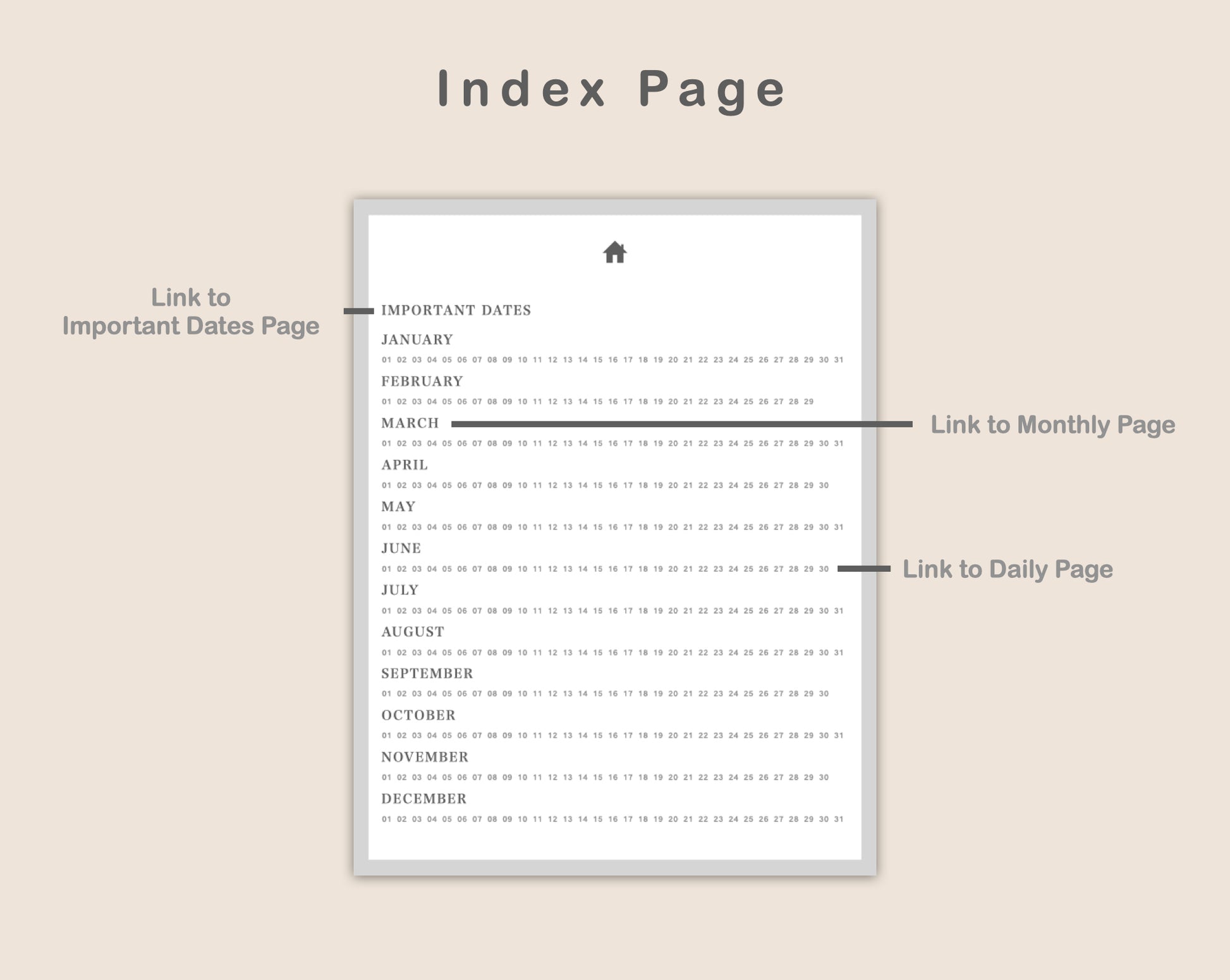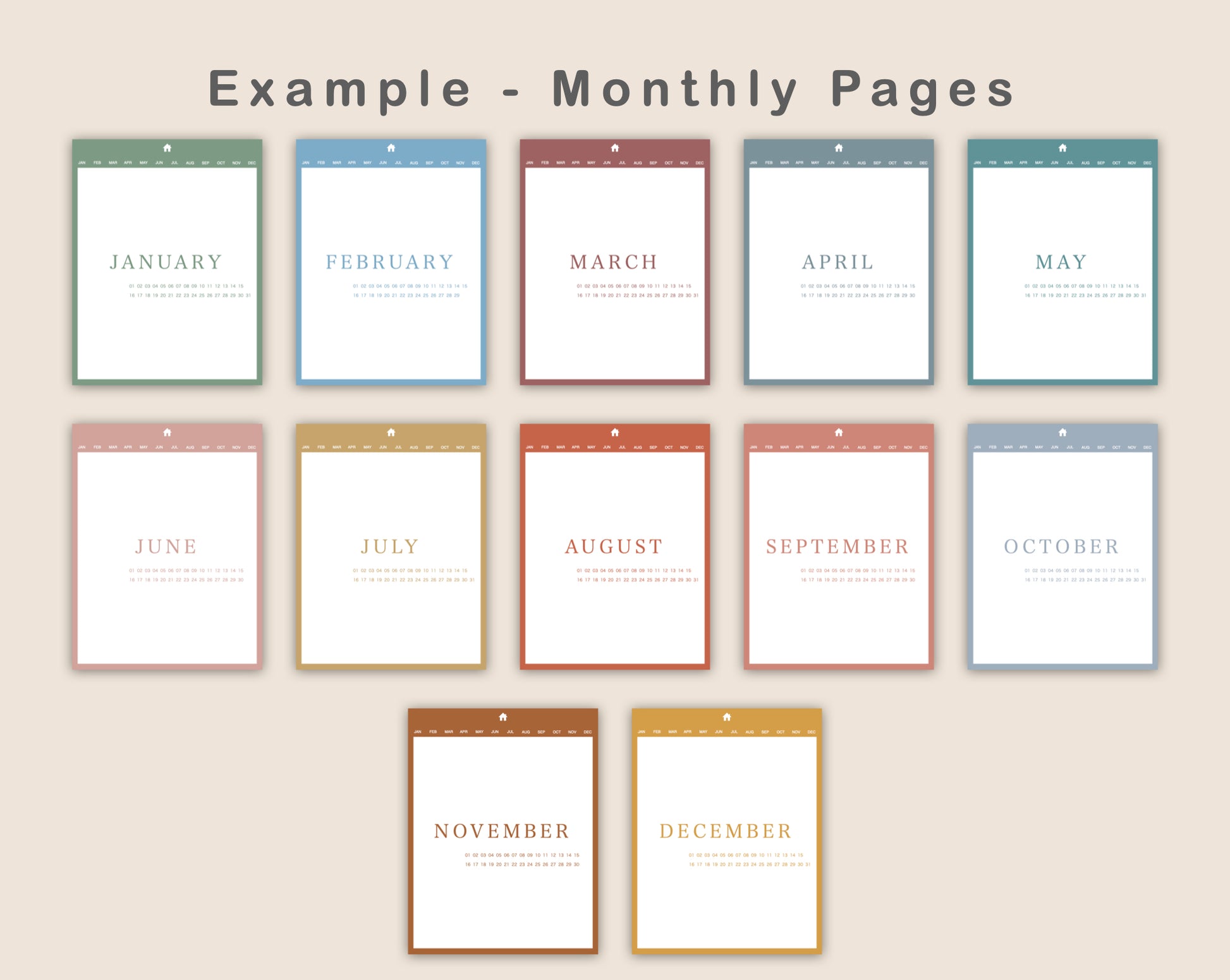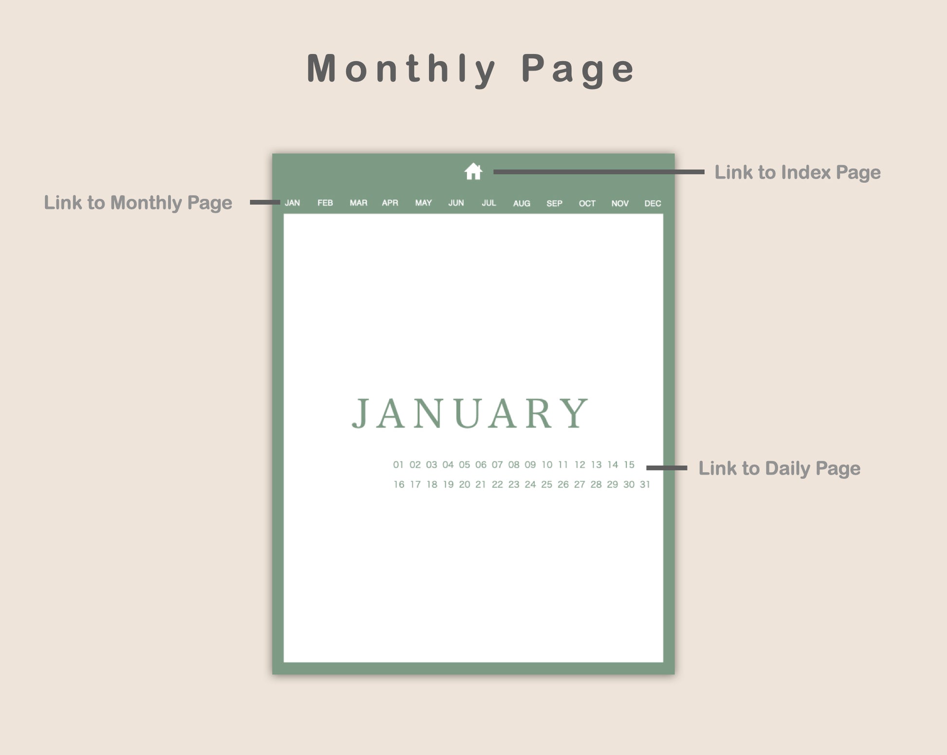 • 12 x Hyperlinked Monthly Pages
