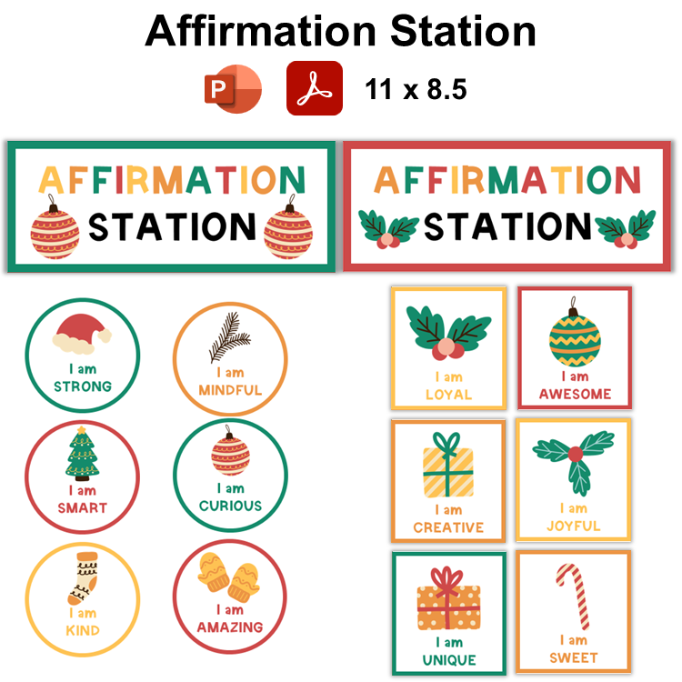 This listing is for a ready-to-print set of Affirmation Station Display with Cute Christmas Theme and an editable template.