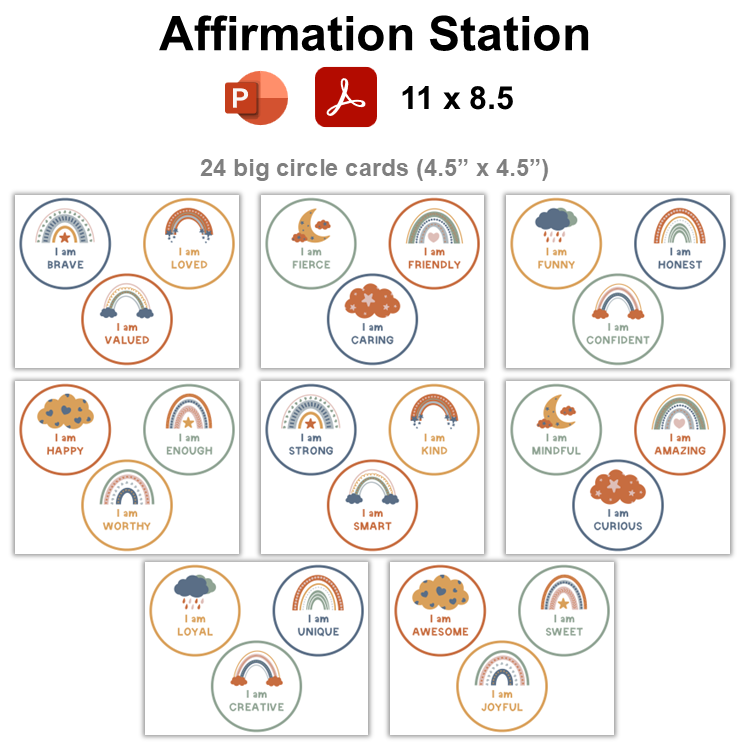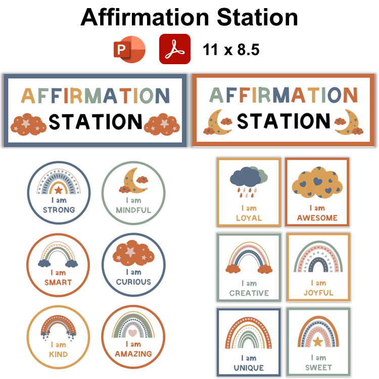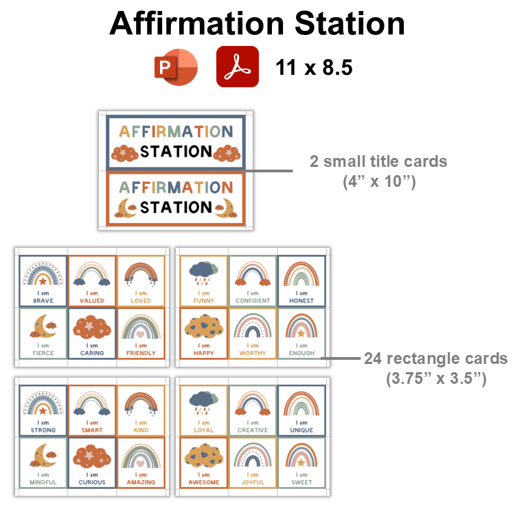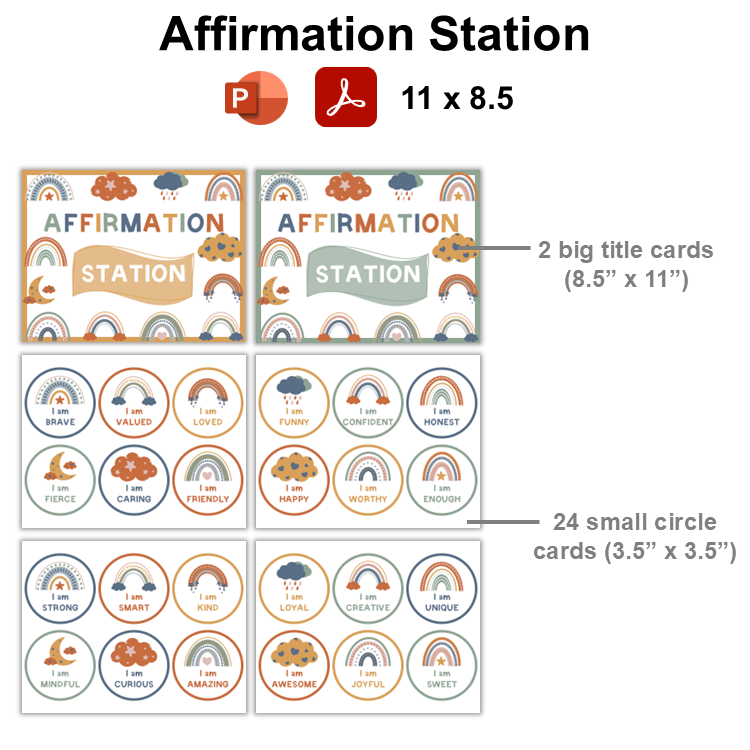 This listing is for a ready-to-print set of Affirmation Station Display with Neutral Rainbow Theme and an editable template.