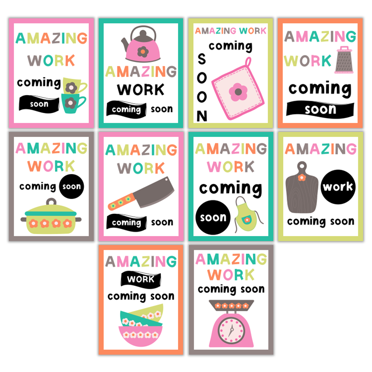 This listing is for a ready-to-print set of Amazing Work Coming Soon posters with Kitchen Utensils Theme. There are 10 designs in the set.
