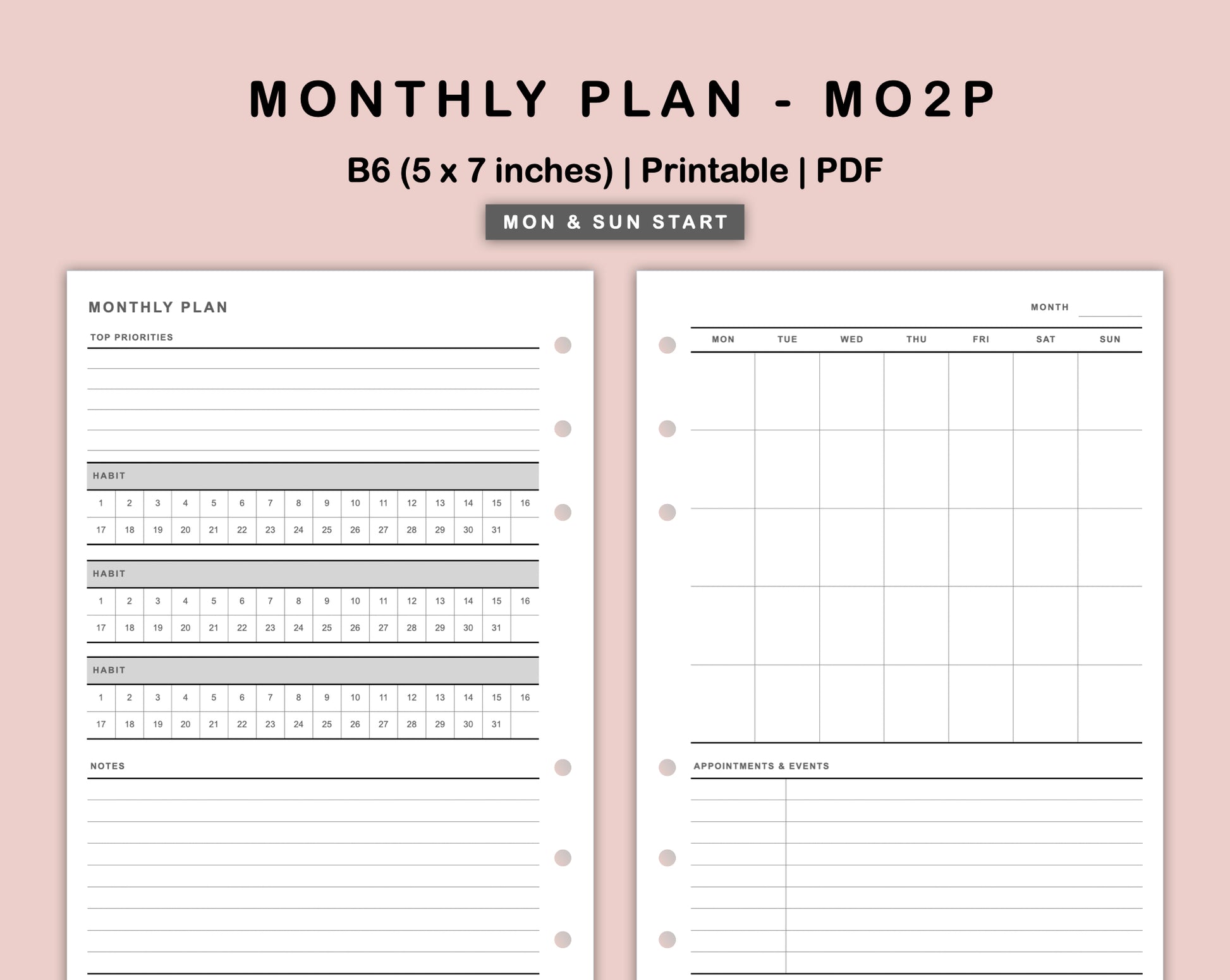 B6 Inserts - Monthly Plan - MO2P - with Habit Tracker
