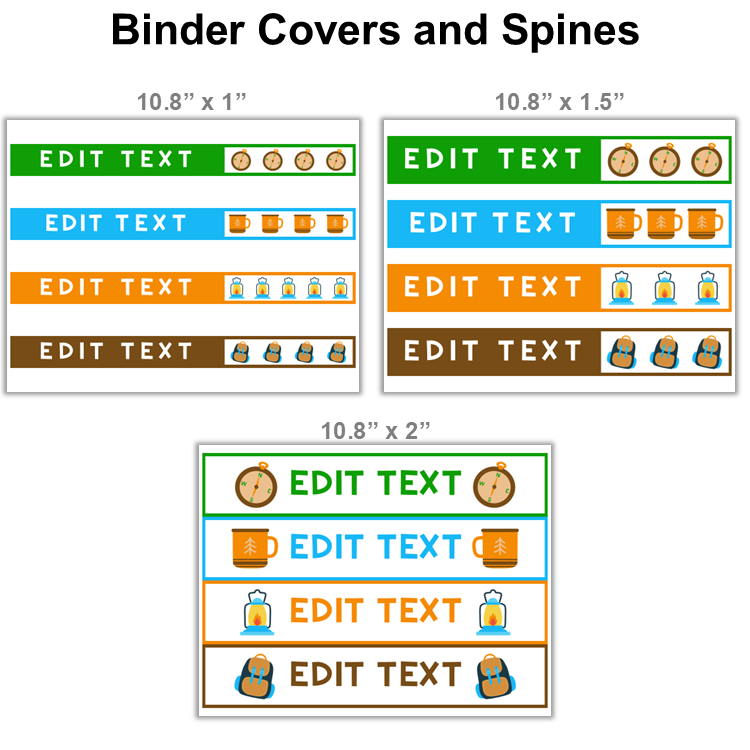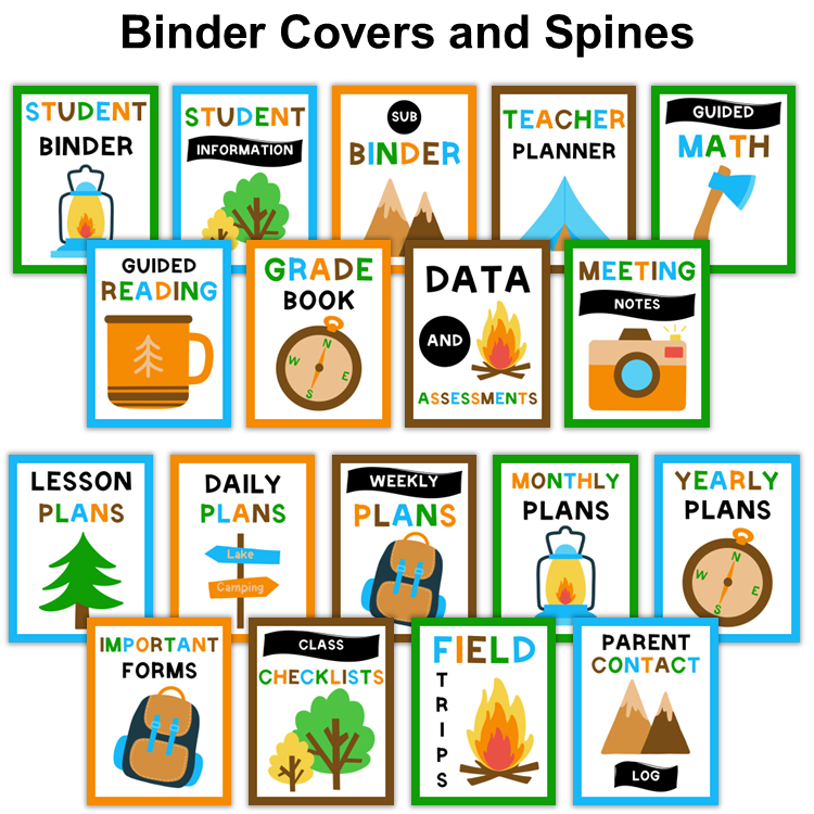 This listing is for an editable template of binder covers and spines with Camping Theme. There are 18 binder covers with the below titles and 3 Binder spine sizes.
