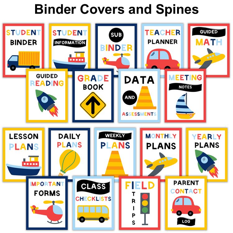 This listing is for an editable template of binder covers and spines with Cute Transportation Theme. There are 18 binder covers with the below titles and 3 Binder spine sizes.
