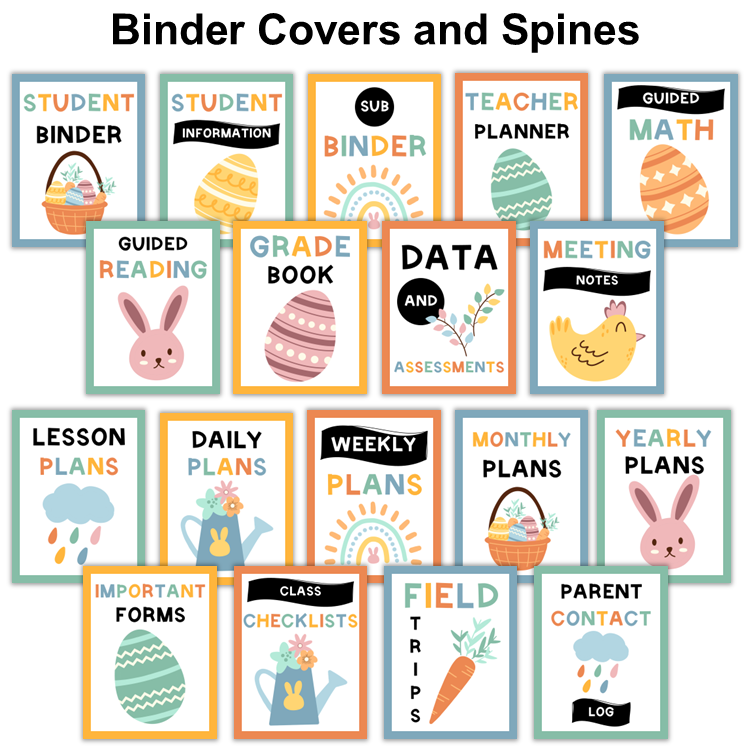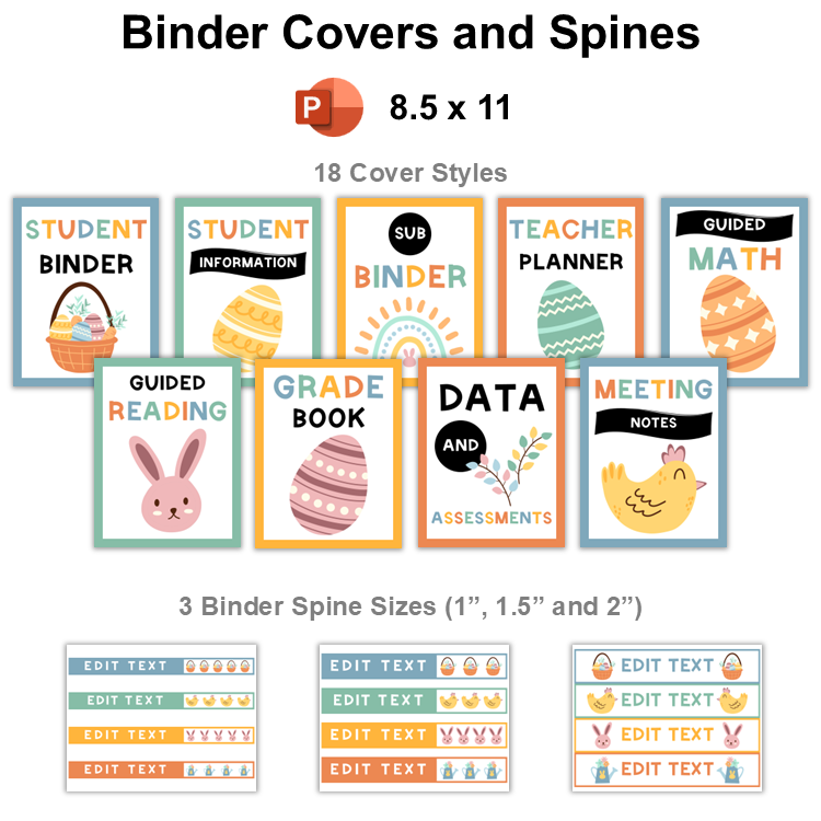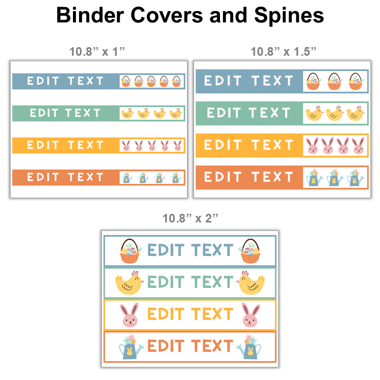 This listing is for an editable template of binder covers and spines with Happy Easter Theme. There are 18 binder covers with the below titles and 3 Binder spine sizes.