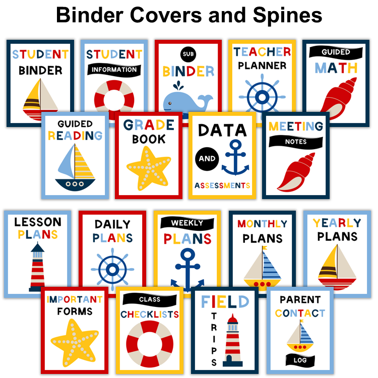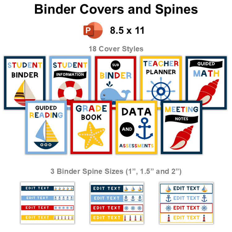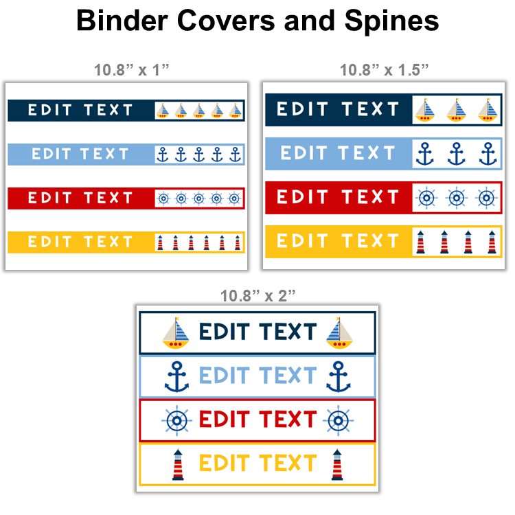 This listing is for an editable template of binder covers and spines with Nautical Theme. There are 18 binder covers with the below titles and 3 Binder spine sizes.