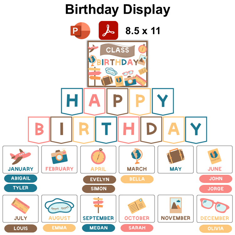 • 2 PDF files containing a ready-to-print birthday sign, happy birthday banner letters, and month signs (11 Pages).