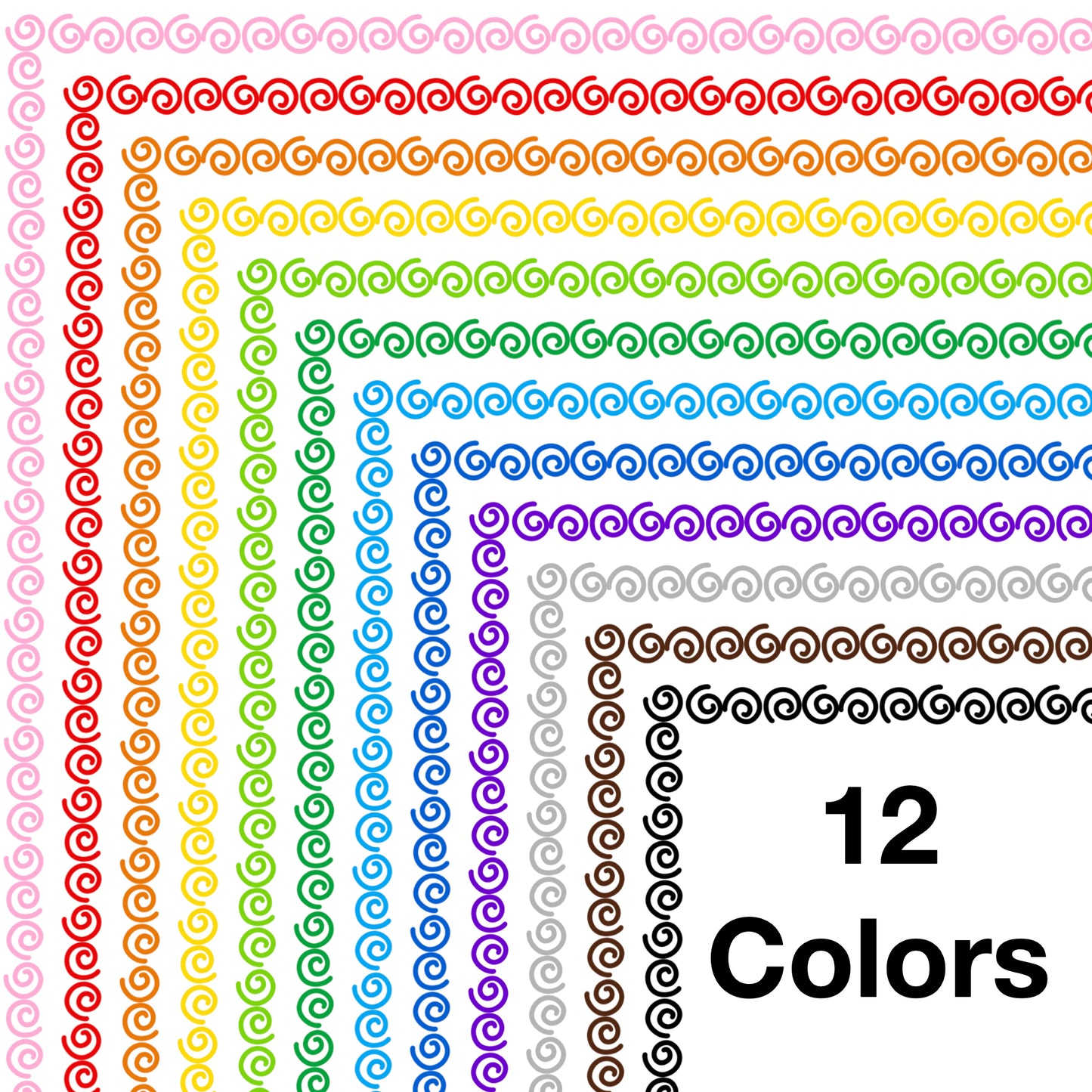 - 72 borders total. 6 border styles in 12 colors including a black and white version.