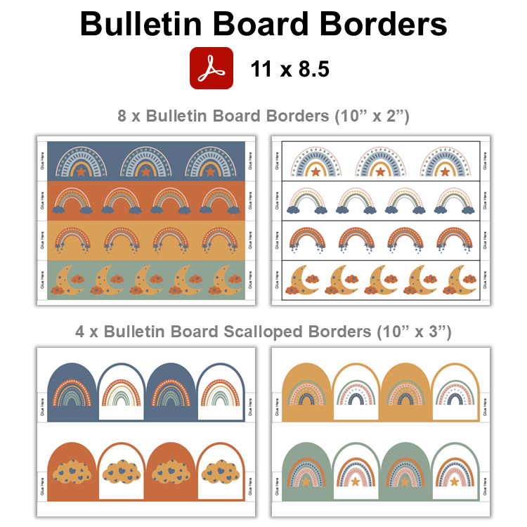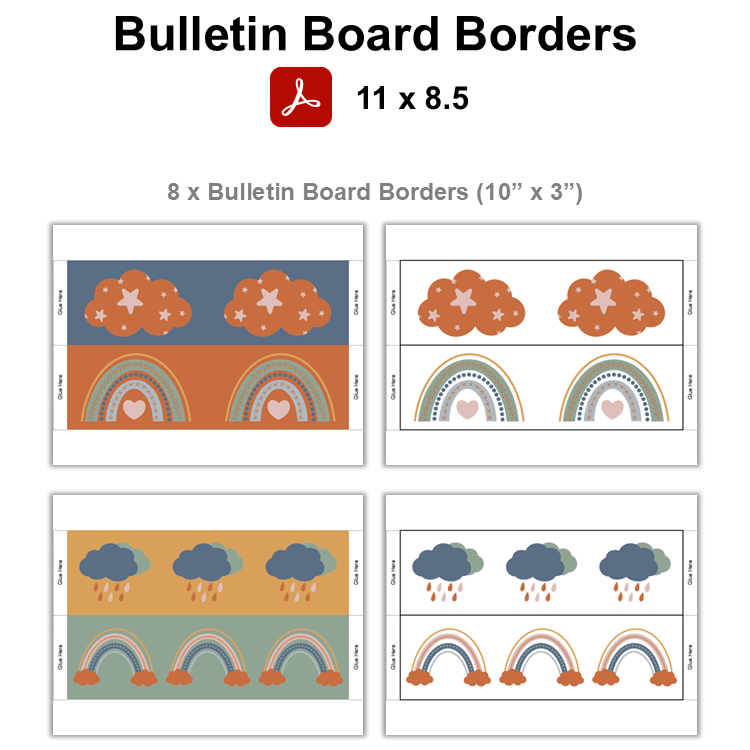 • 1 PDF file containing ready-to-print Bulletin Board Borders (8 Pages).