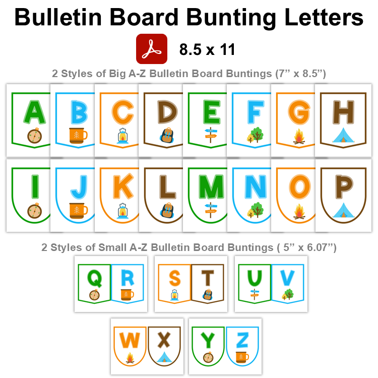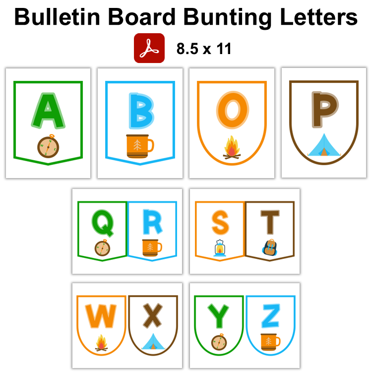 This listing is for a ready-to-print set of Bulletin Board Bunting Letters with Camping Theme.