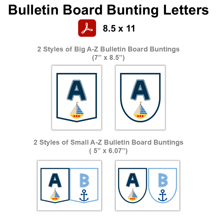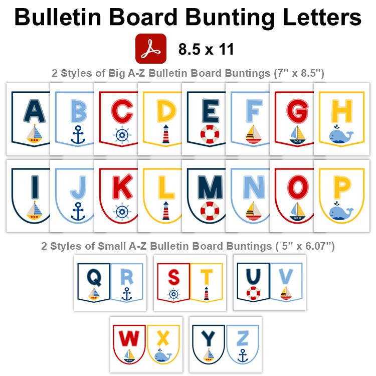 This listing is for a ready-to-print set of Bulletin Board Bunting Letters with Nautical Theme.
