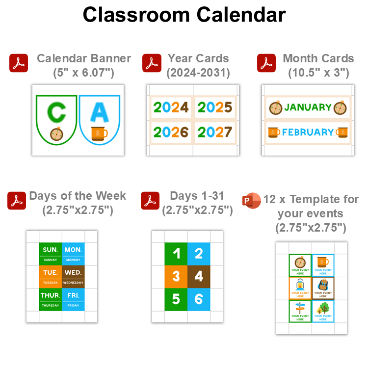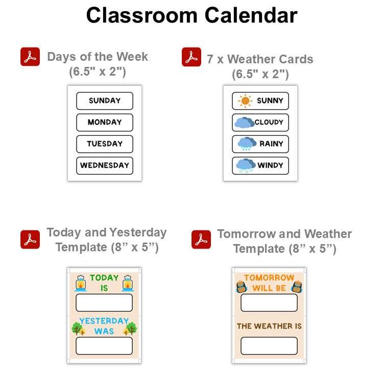 • 2 PDF files containing a ready-to-print Calendar Banner, Year Cards, Month Cards, Days of the Week, Days 1-31, Today Template, Yesterday Template, Tomorrow Template, Weather Template, Days of the Week, and 7 Weather Cards (26 Pages).