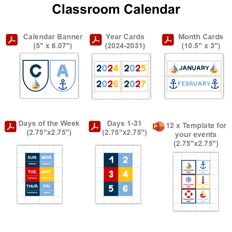 This listing is for a set of Classroom Calendar with Nautical Theme.