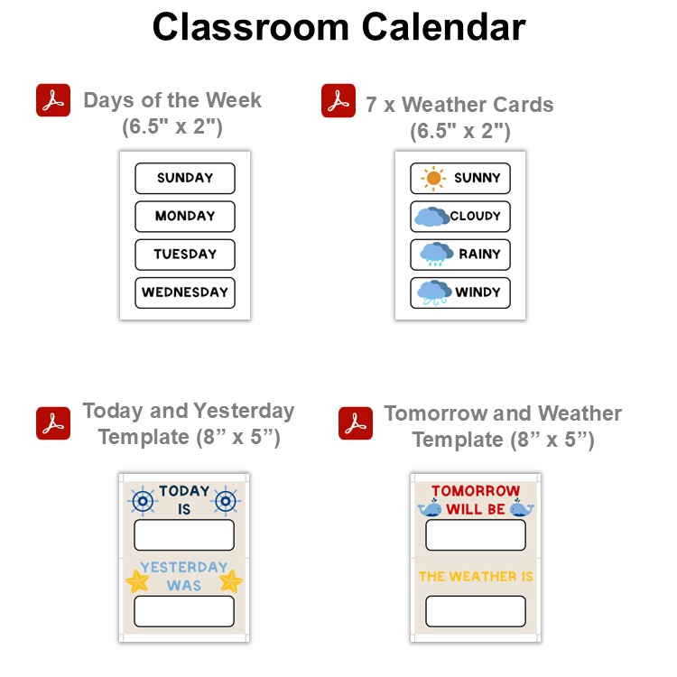 • 2 PDF files containing a ready-to-print Calendar Banner, Year Cards, Month Cards, Days of the Week, Days 1-31, Today Template, Yesterday Template, Tomorrow Template, Weather Template, Days of the Week, and 7 Weather Cards (26 Pages).