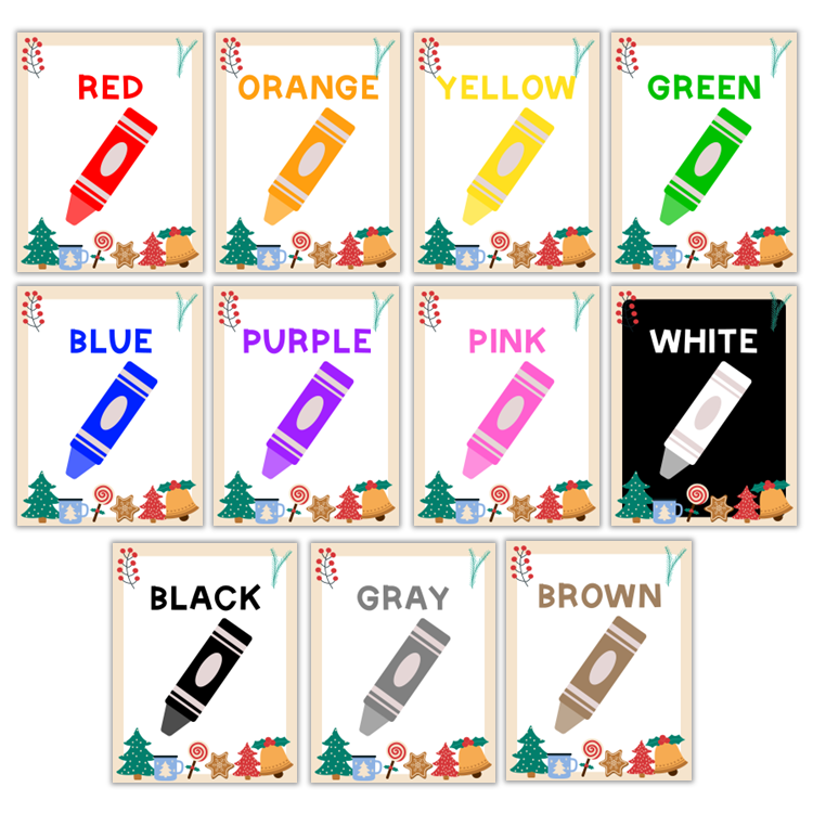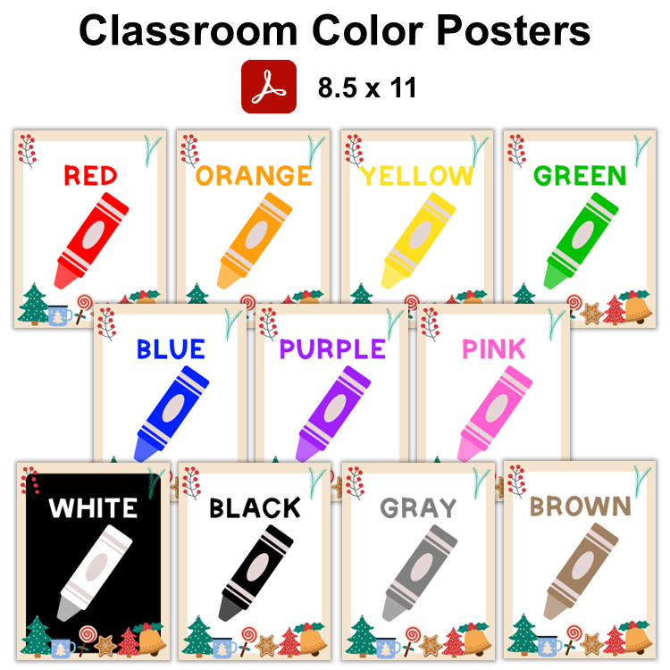 This listing is for a ready-to-print set of classroom color posters with Bright Christmas Theme. It includes 11 colors: Red, Orange, Yellow, Green, Blue, Purple, Pink, White, Black, Gray, and Brown.