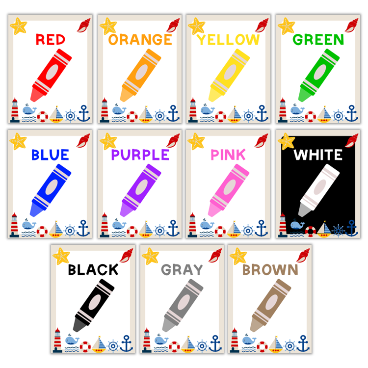 This listing is for a ready-to-print set of classroom color posters with Nautical Theme. It includes 11 colors: Red, Orange, Yellow, Green, Blue, Purple, Pink, White, Black, Gray, and Brown.