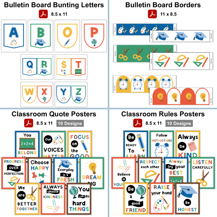 This listing is for a bundle of School Supplies Theme Classroom Decoration. All listings are downloadable files that you can access immediately after purchase. The bundle includes