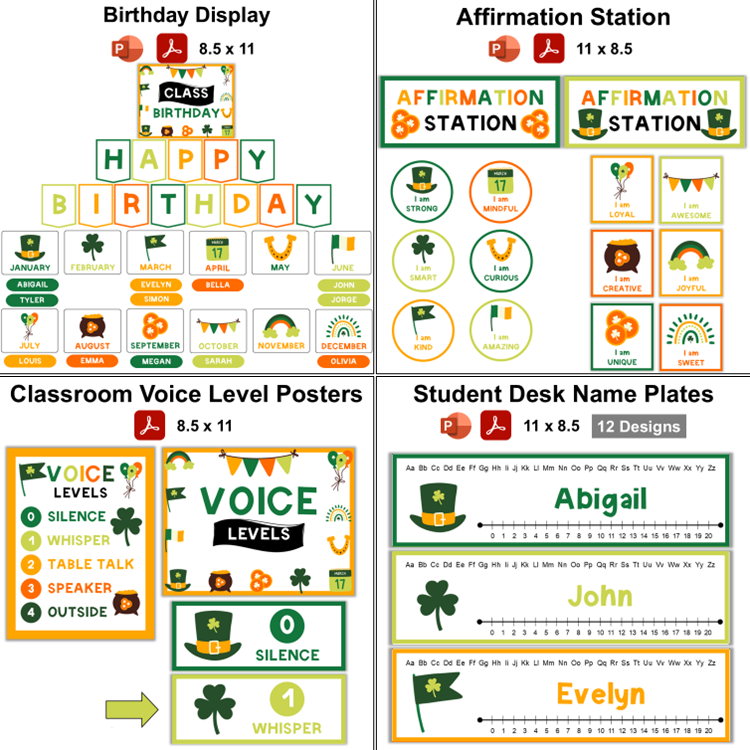 This listing is for a bundle of St. Patrick's Day Theme Classroom Decoration. All listings are downloadable files that you can access immediately after purchase. The bundle includes