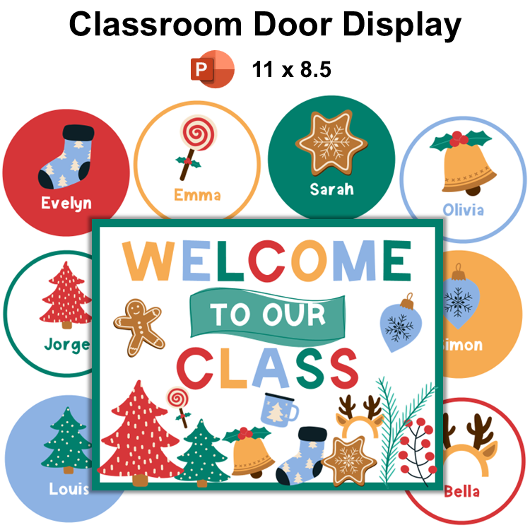 This listing is for an editable template of Classroom Door Display with Bright Christmas Theme.
