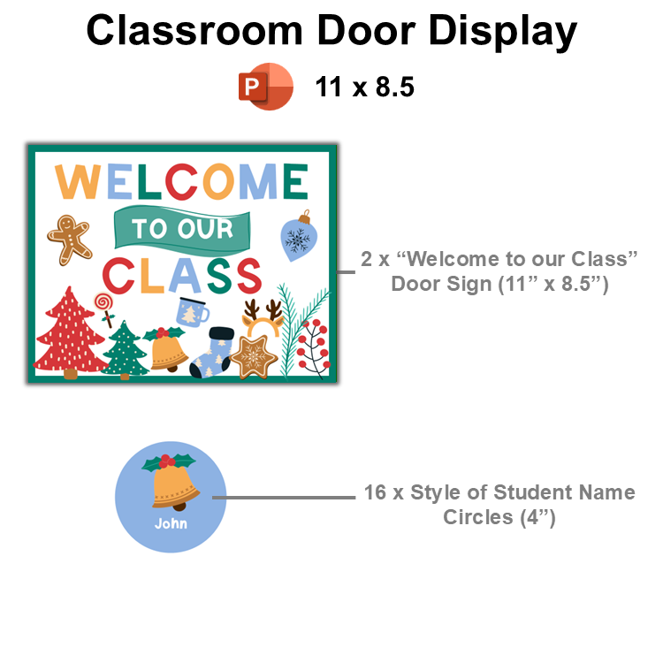 • 1 PowerPoint file containing an editable template of “Welcome to our Class” door sign (2 Pages) and student name circles (4 Pages).