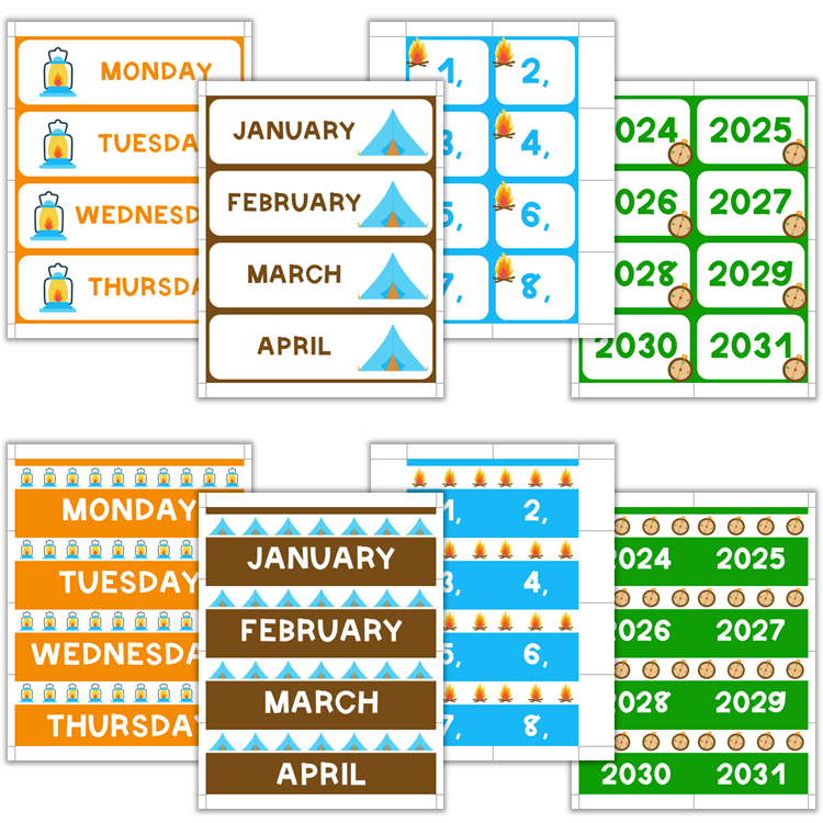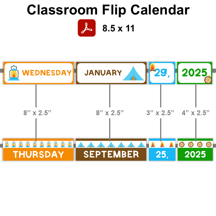 This listing is for a ready-to-print set of Classroom Flip Calendar with Camping Theme.