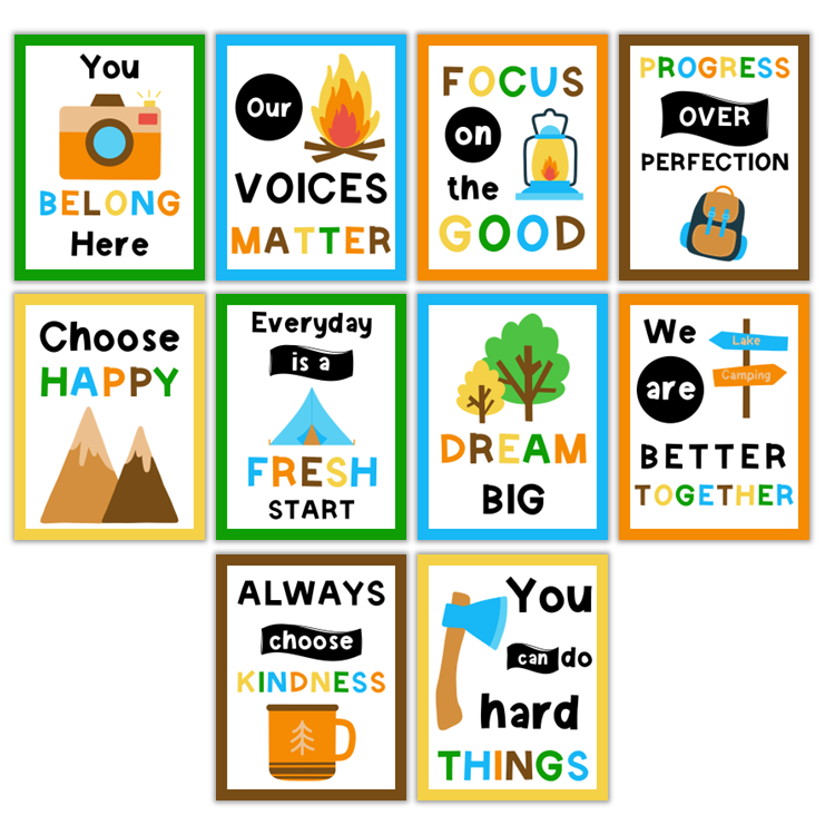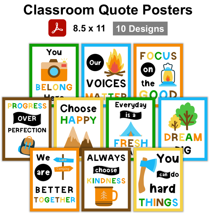 This listing is for a ready-to-print set of classroom quote posters with Camping Theme. There are 10 designs in the set with the following quotes