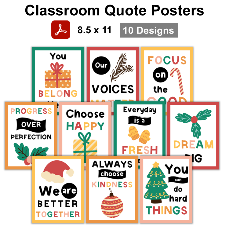 This listing is for a ready-to-print set of classroom quote posters with Cute Christmas Theme. There are 10 designs in the set with the following quotes