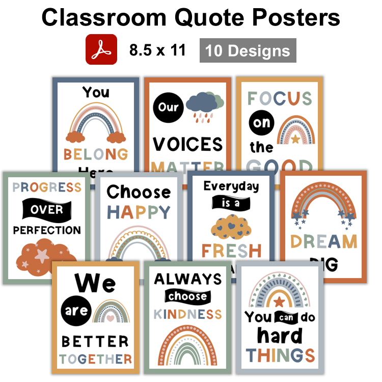 This listing is for a ready-to-print set of classroom quote posters with Neutral Rainbow Theme. There are 10 designs in the set with the following quotes