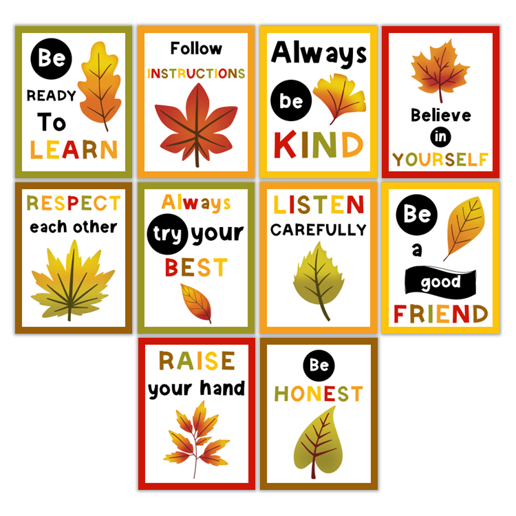 This listing is for a ready-to-print set of classroom rules with Autumn Leaves Theme. There are 10 designs in the set with the following rules