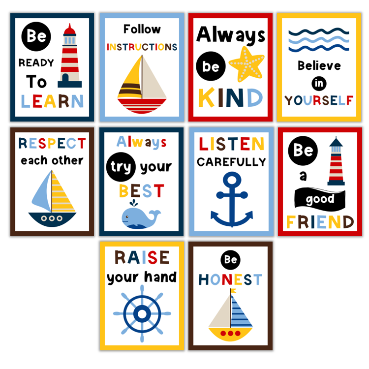 This listing is for a ready-to-print set of classroom rules with Nautical Theme. There are 10 designs in the set with the following rules