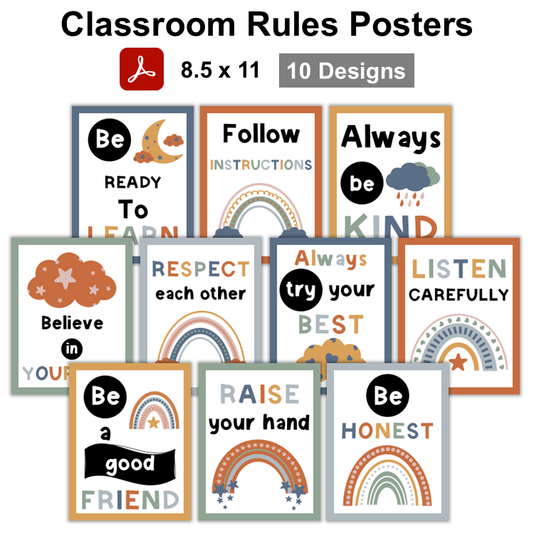 This listing is for a ready-to-print set of classroom rules with Neutral Rainbow Theme. There are 10 designs in the set with the following rules