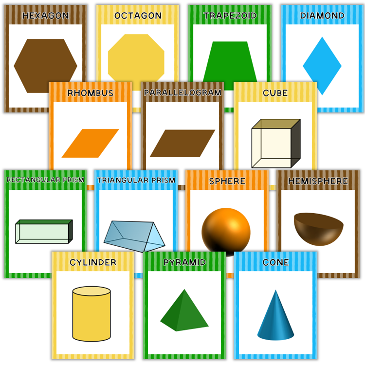 This listing is for a ready-to-print set of shapes with Camping Theme. There are 22 shapes in the set: Square, Rectangle, Triangle, Star, Circle, Oval, Heart, Pentagon, Hexagon, Octagon, Trapezoid, Diamond, Rhombus, Parallelogram, Cube, Rectangular Prism, Triangular Prism, Sphere, Hemisphere, Cylinder, Pyramid, and Cone.