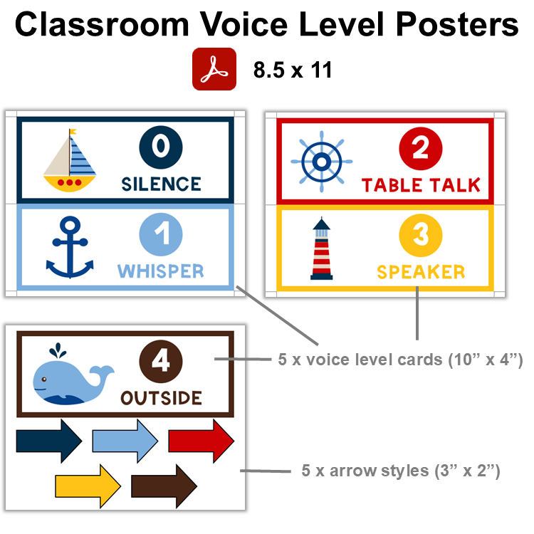 This listing is for a ready-to-print set of Classroom Voice Level Posters with Nautical Theme.
