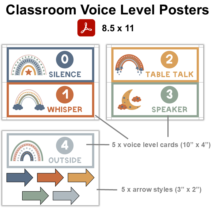 This listing is for a ready-to-print set of Classroom Voice Level Posters with Neutral Rainbow Theme.
