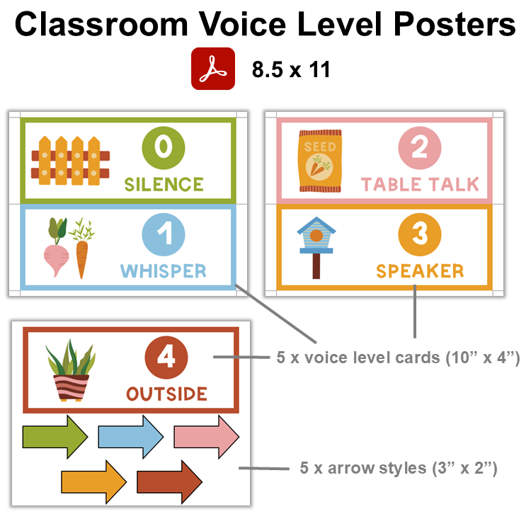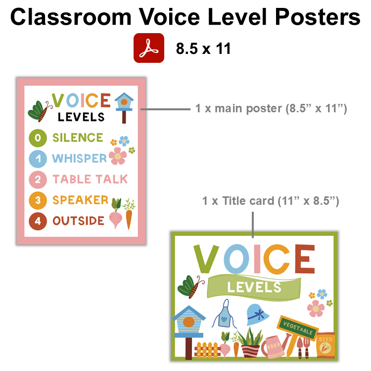 • 2 PDF file containing ready-to-print Classroom Voice Level Posters (5 Pages).