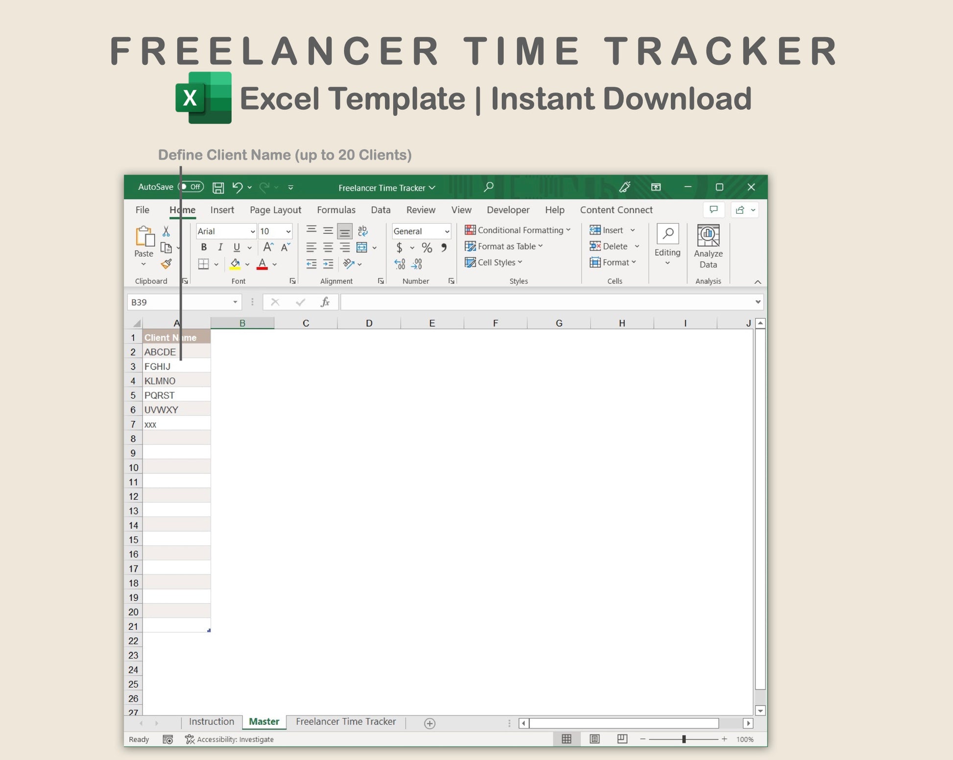This Freelancer Time Tracker Spreadsheet for Excel is made in NEUTRAL theme in order to help you track your time spent for each client.
