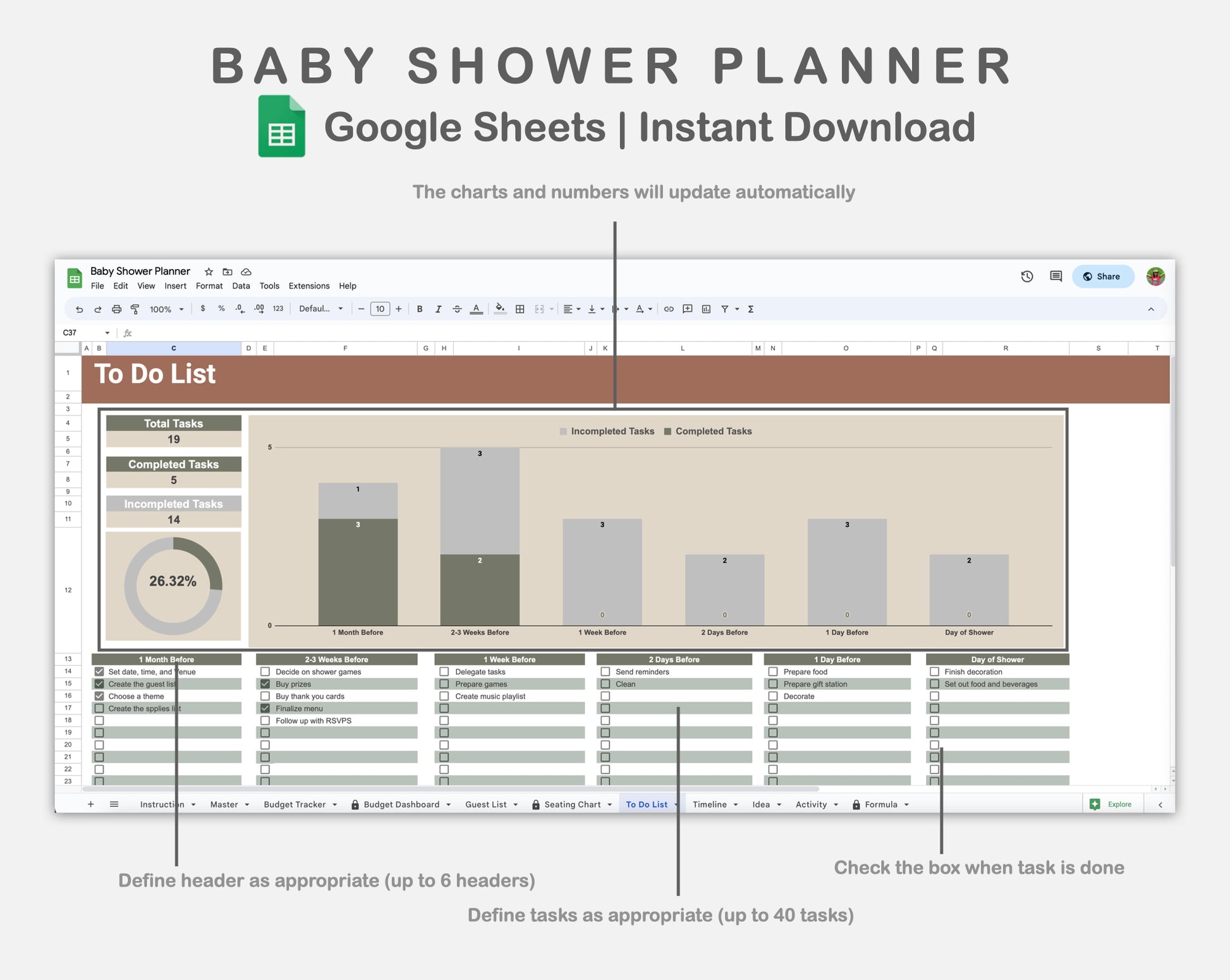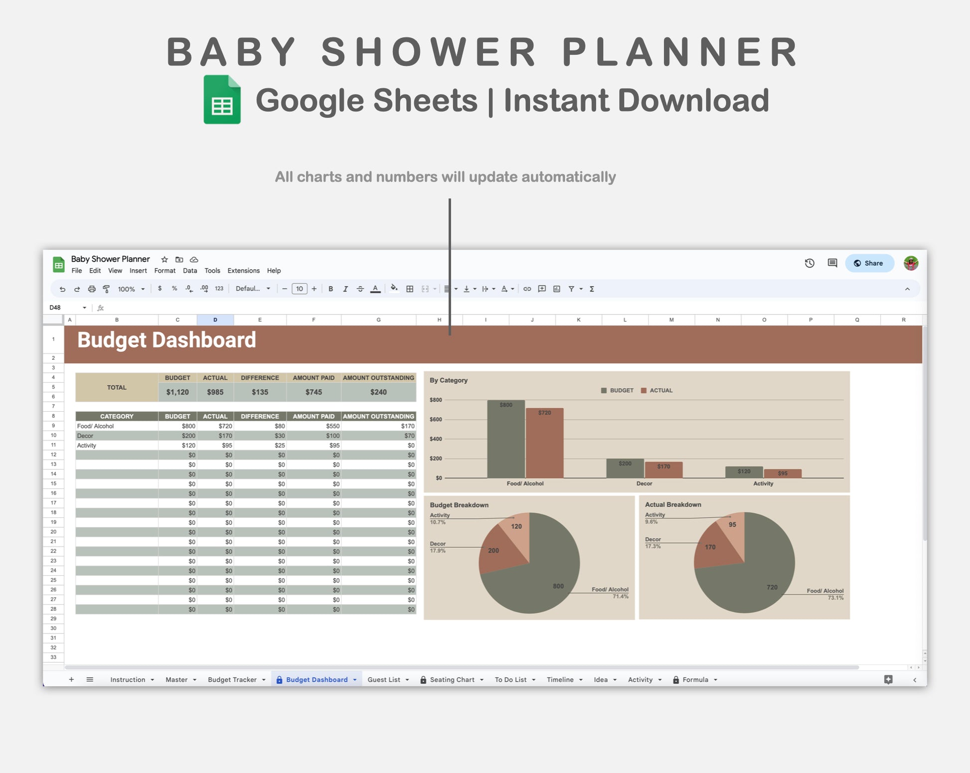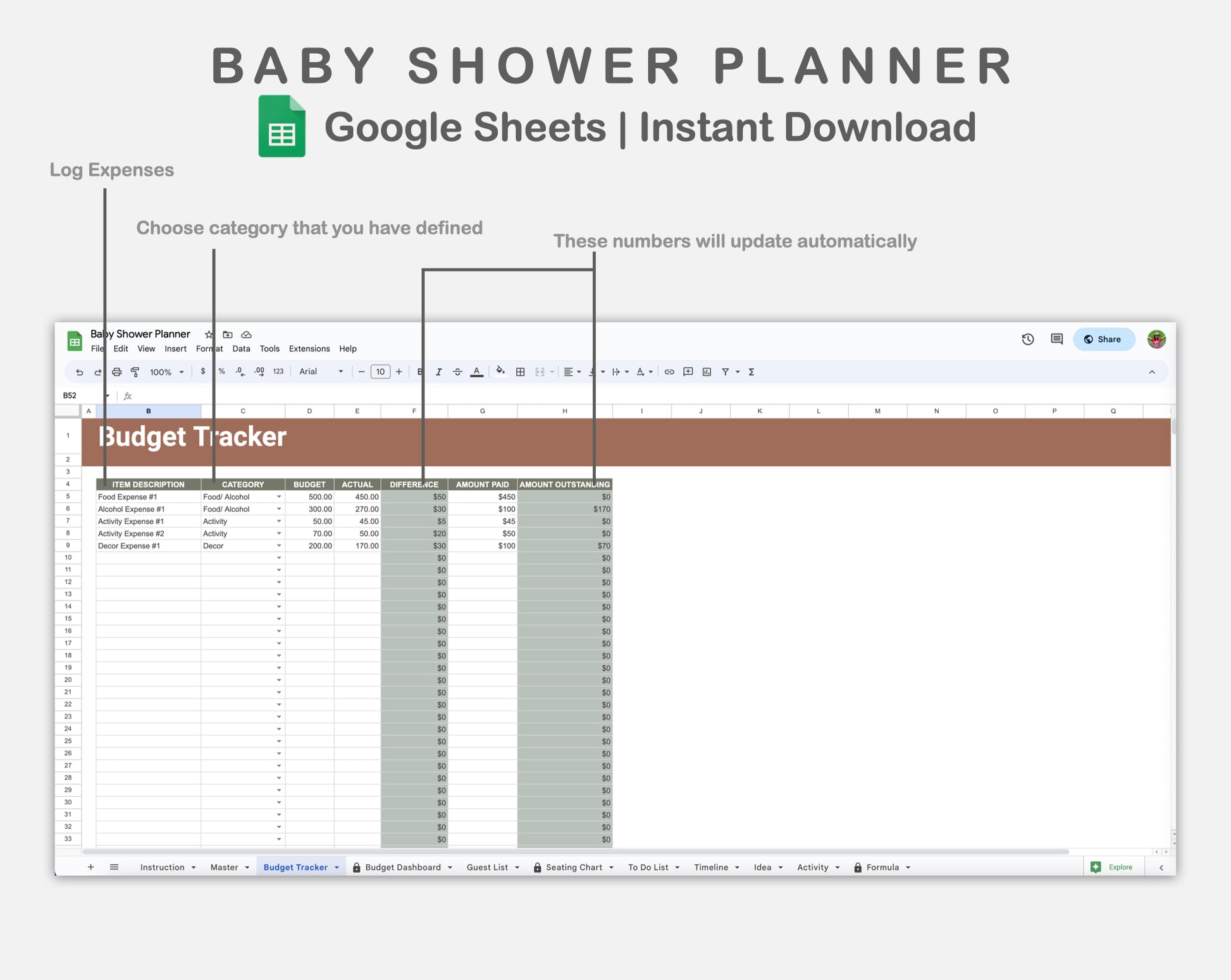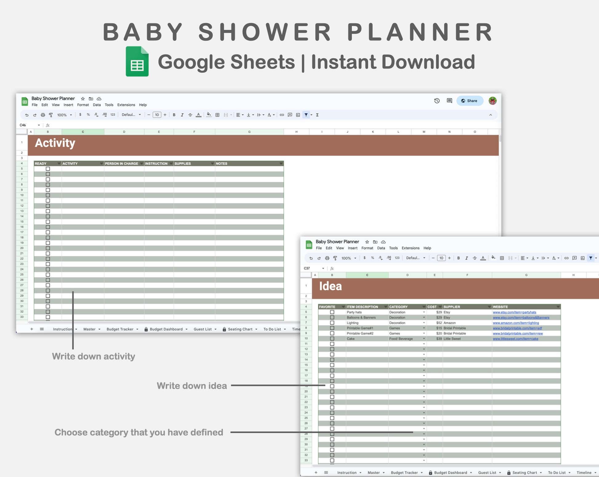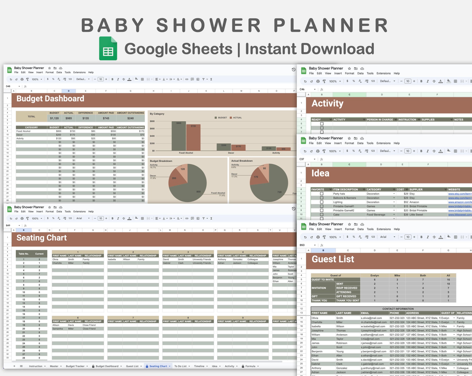This Baby Shower Planner Spreadsheet for Google Sheets is made in EARTHY theme in order to help you plan and organize your baby shower party easily and effortlessly.
