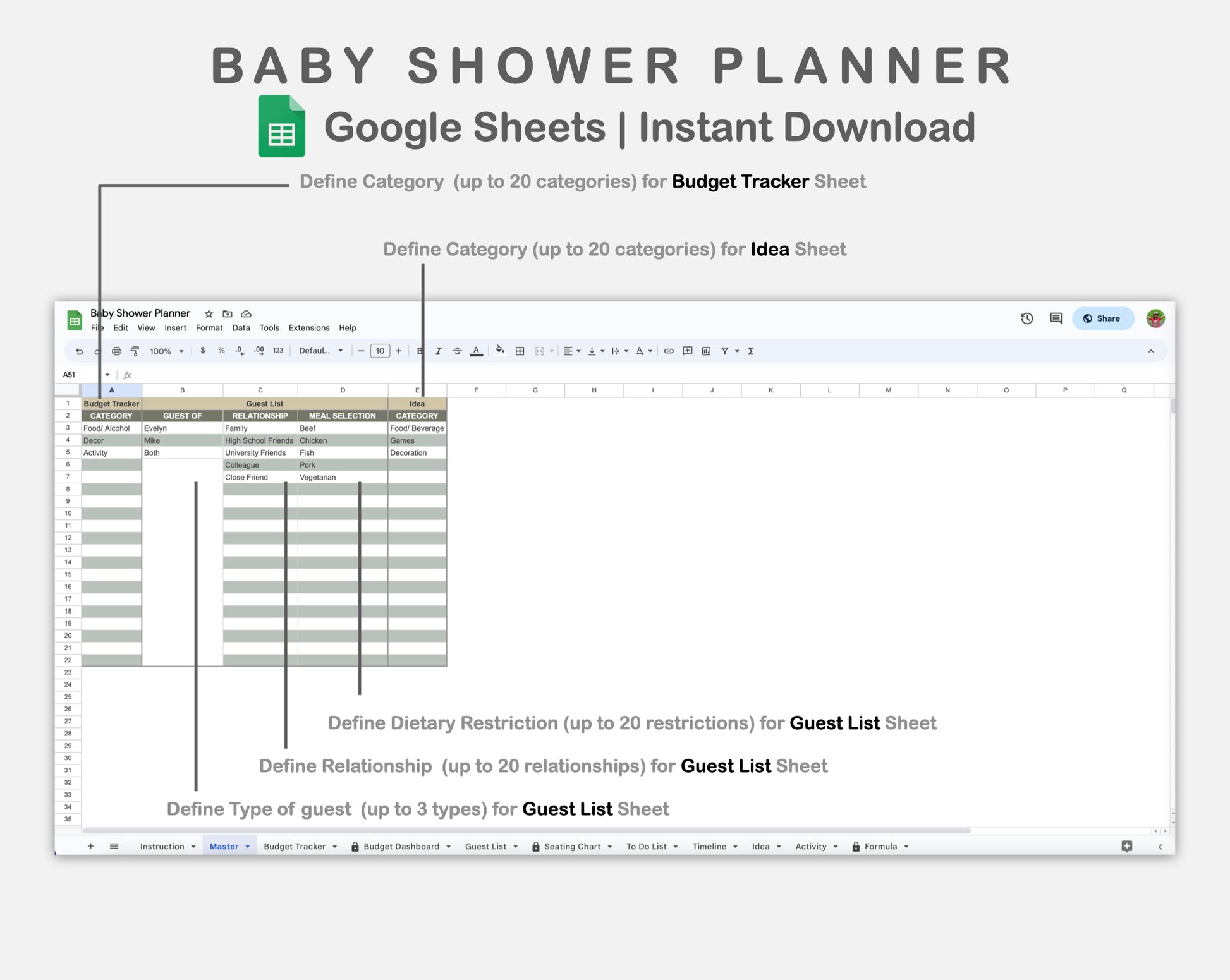 • There are 11 sheets: Instruction, Master, Budget Tracker, Budget Dashboard, Guest List, Seating Chart, To Do List, Timeline, Idea, Activity, and Formula.