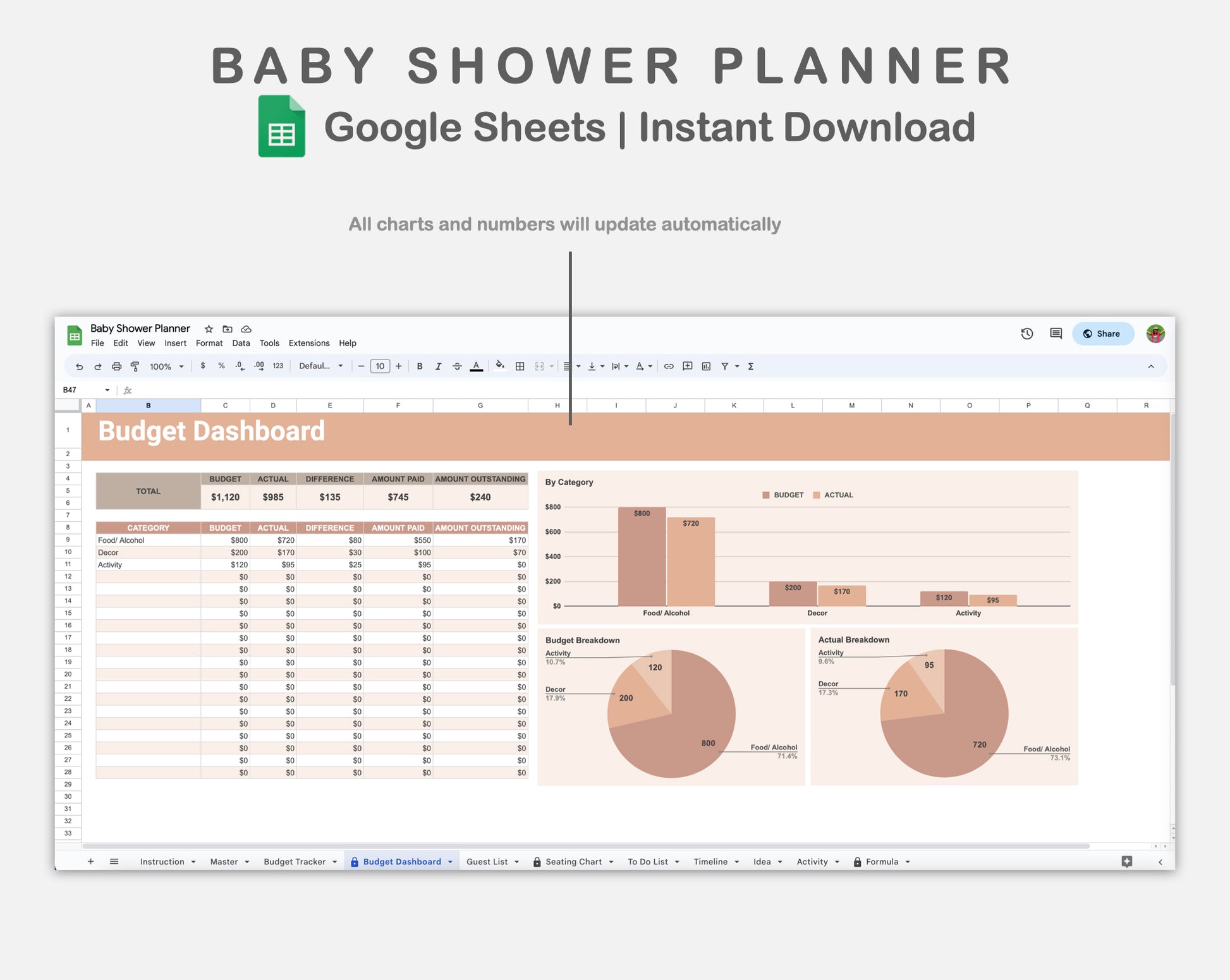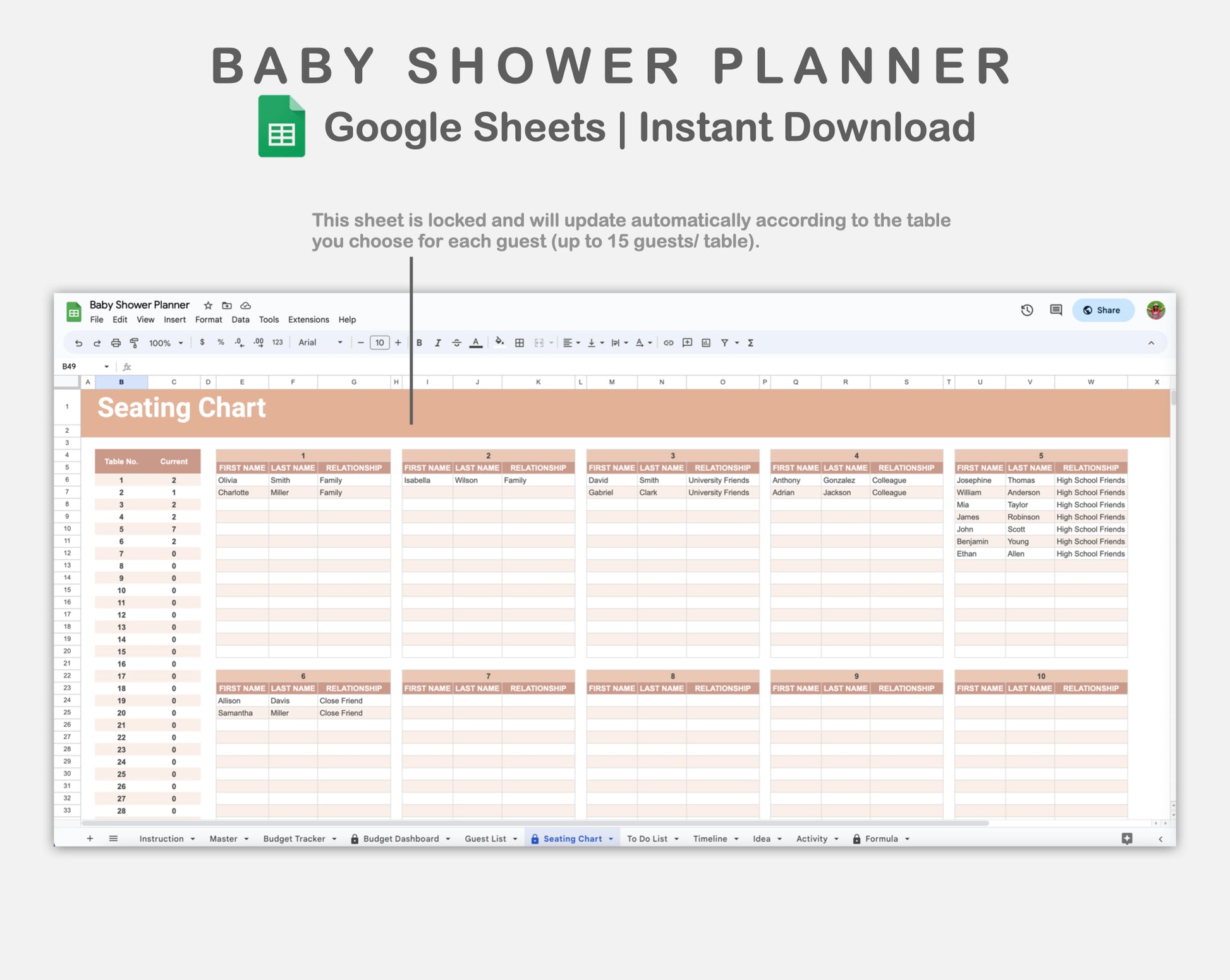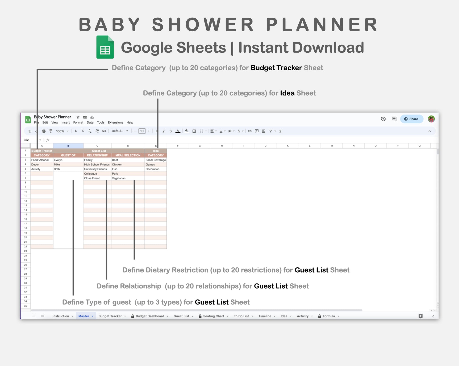 • There are 11 sheets: Instruction, Master, Budget Tracker, Budget Dashboard, Guest List, Seating Chart, To Do List, Timeline, Idea, Activity, and Formula.