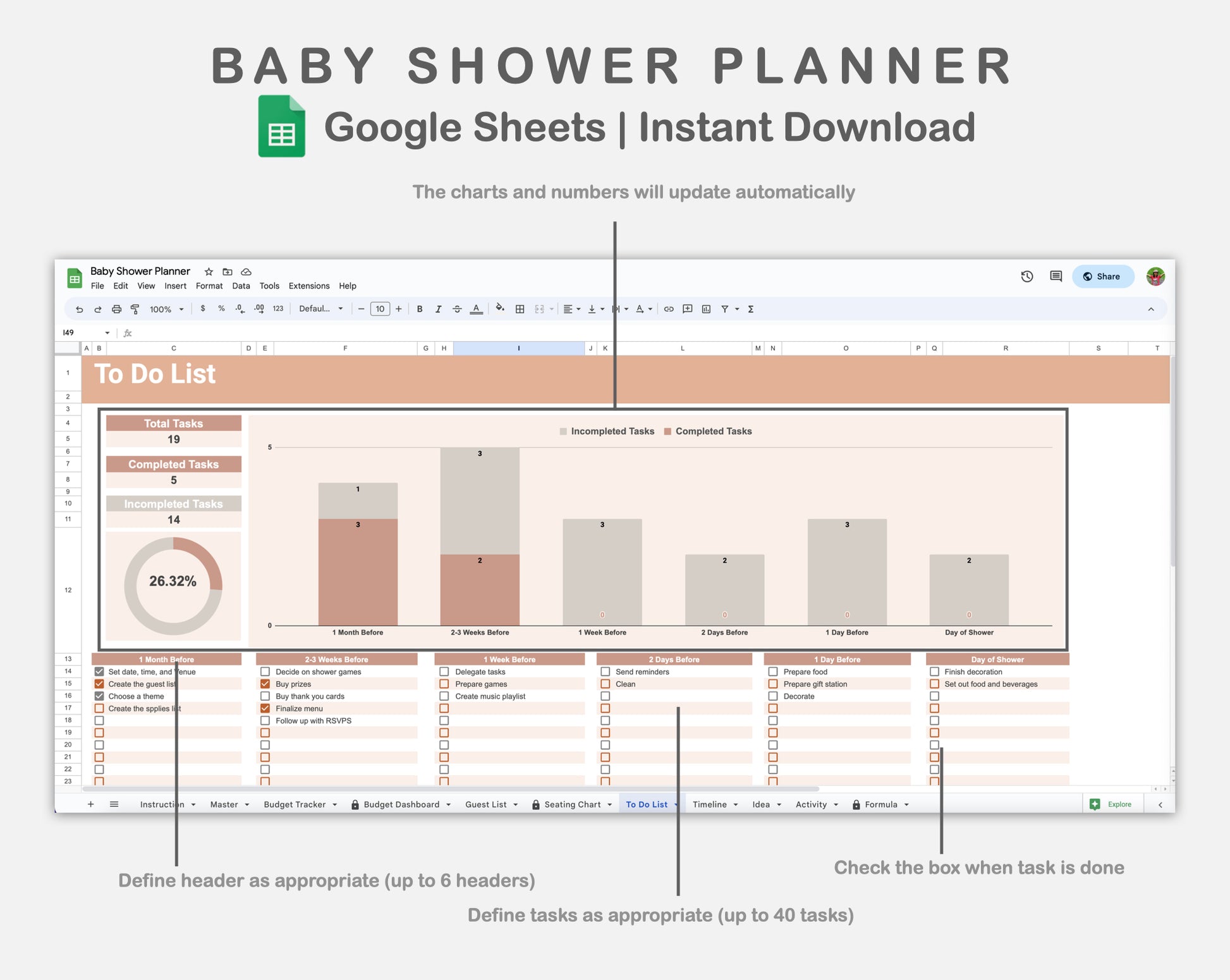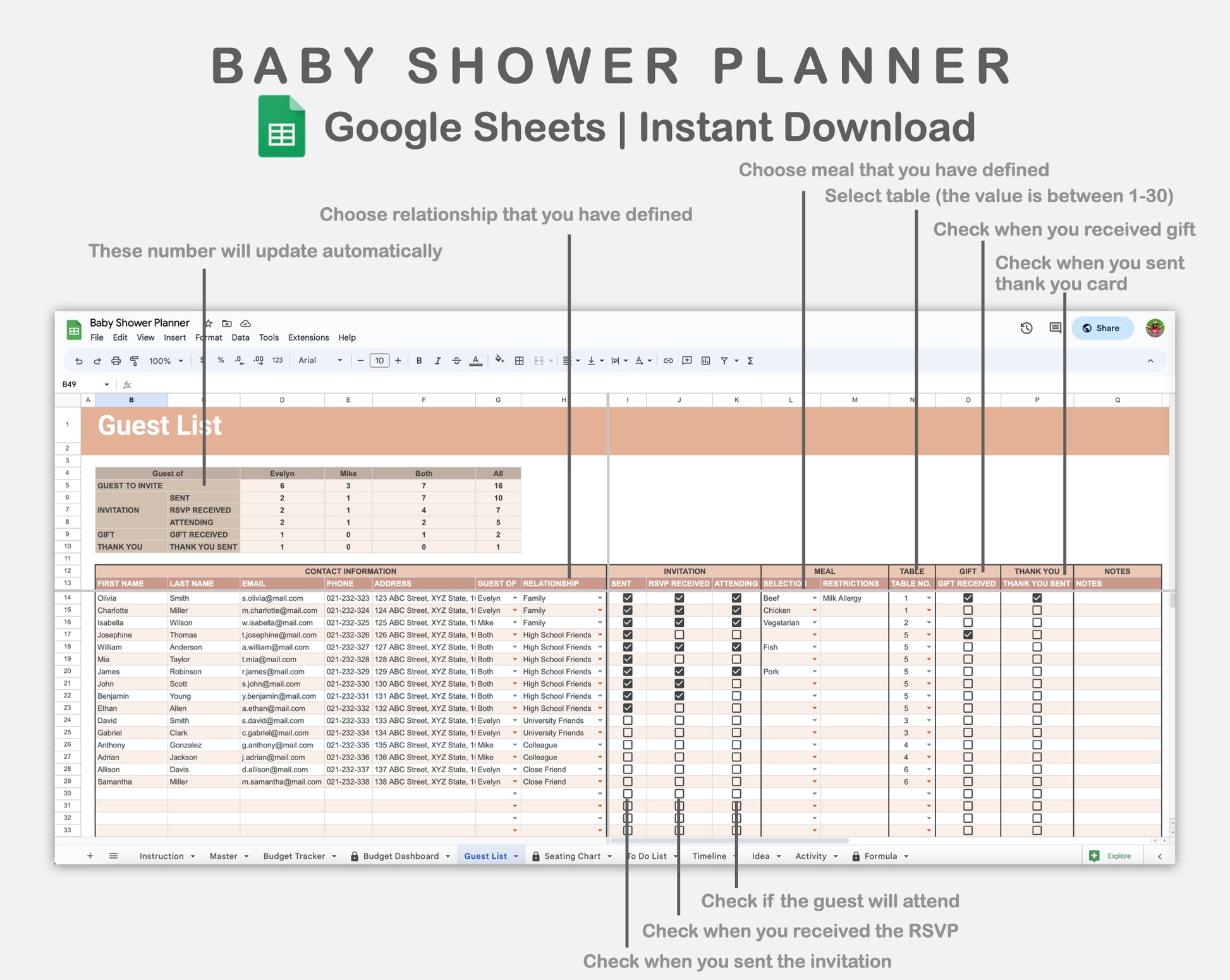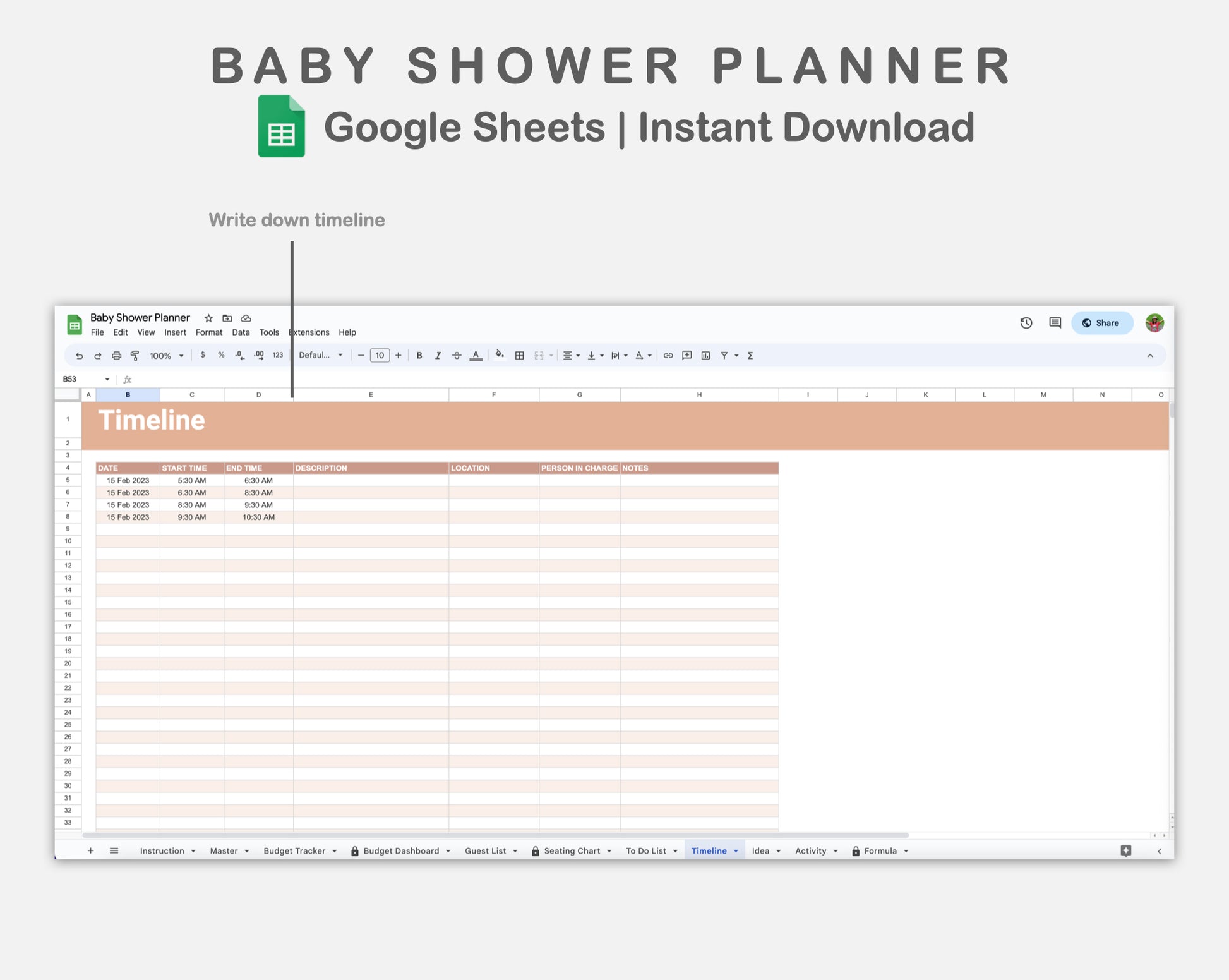 • There are 11 sheets: Instruction, Master, Budget Tracker, Budget Dashboard, Guest List, Seating Chart, To Do List, Timeline, Idea, Activity, and Formula.