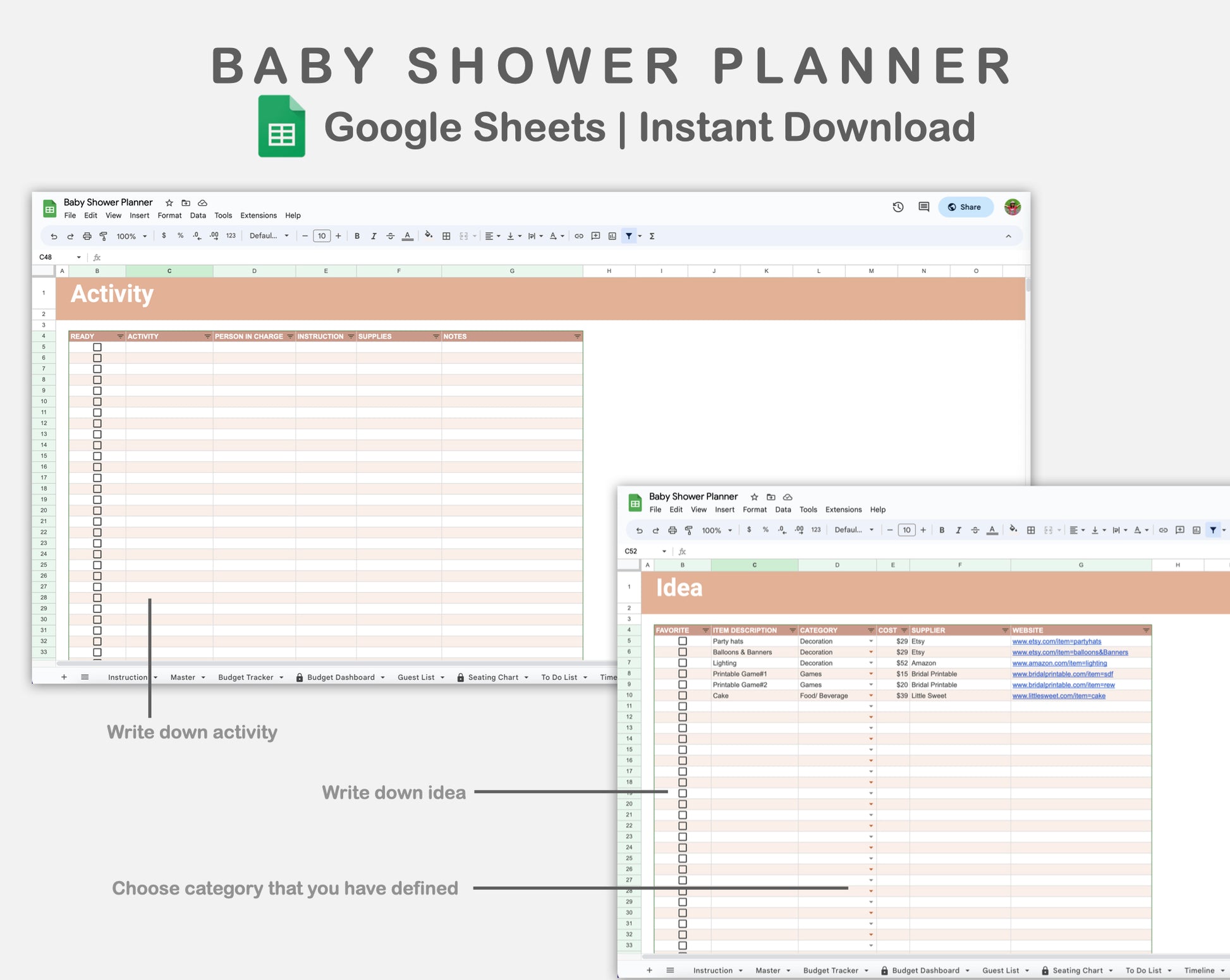 This Baby Shower Planner Spreadsheet for Google Sheets is made in NEUTRAL theme in order to help you plan and organize your baby shower party easily and effortlessly.