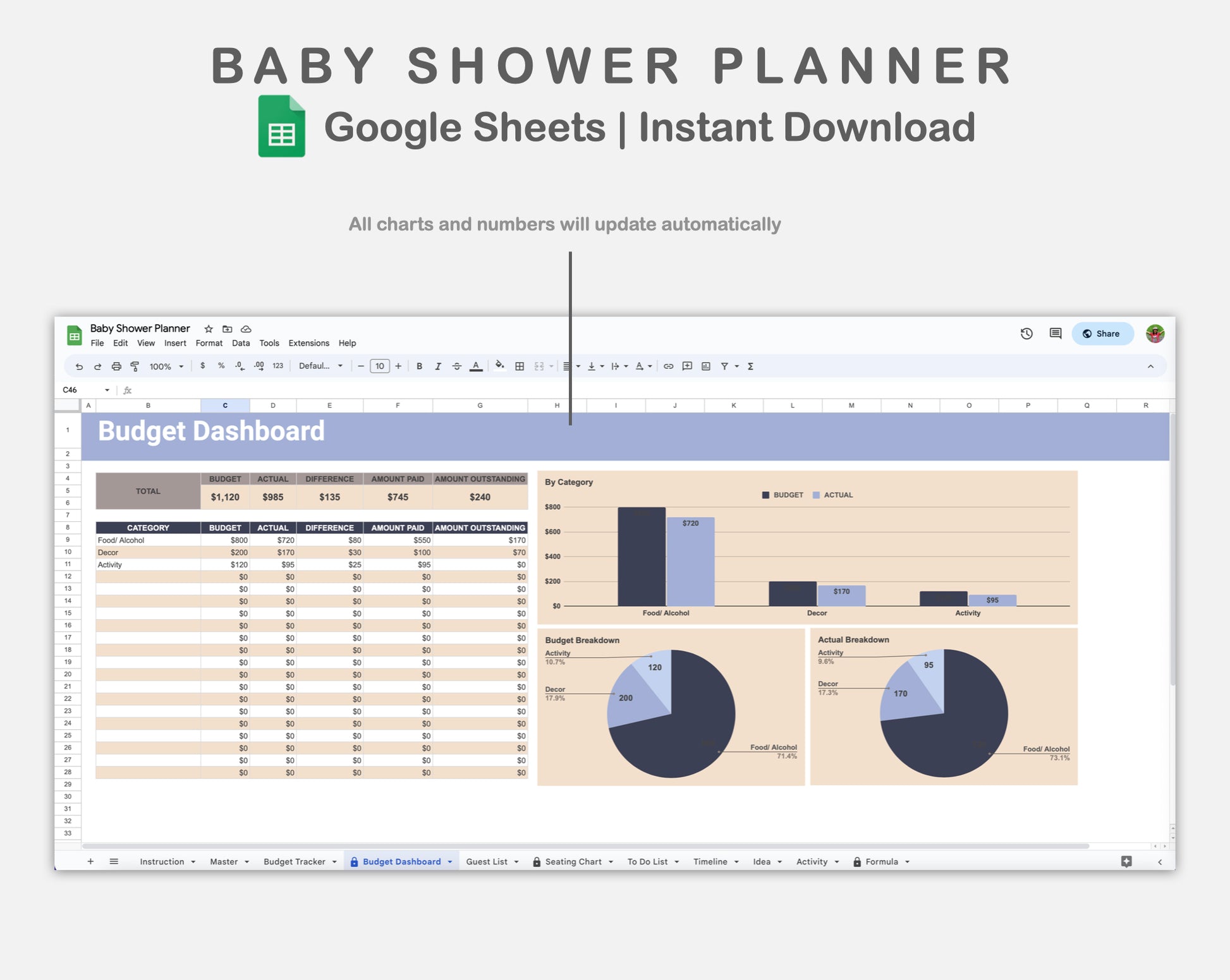 • There are 11 sheets: Instruction, Master, Budget Tracker, Budget Dashboard, Guest List, Seating Chart, To Do List, Timeline, Idea, Activity, and Formula.