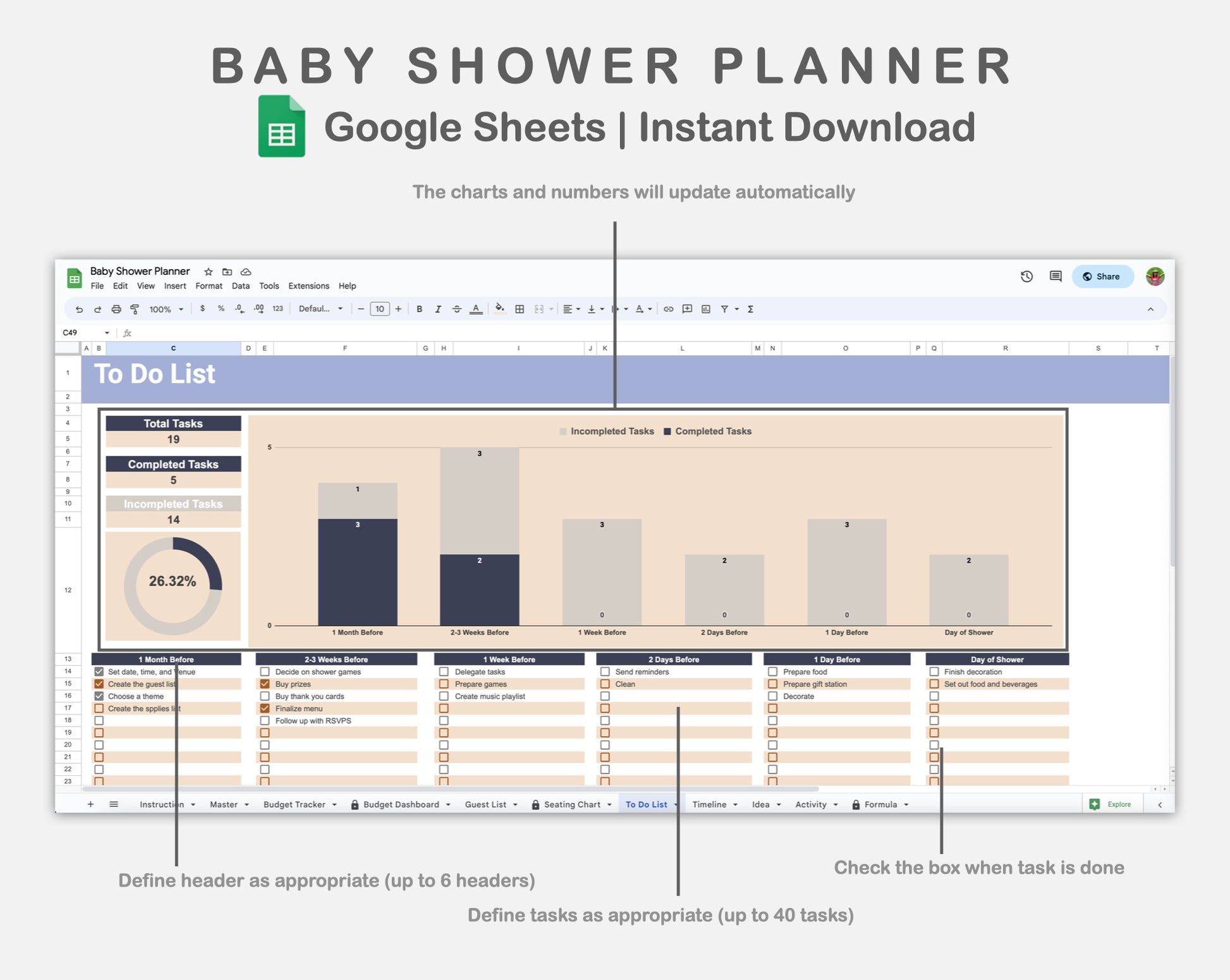 This Baby Shower Planner Spreadsheet for Google Sheets is made in SWEET theme in order to help you plan and organize your baby shower party easily and effortlessly.