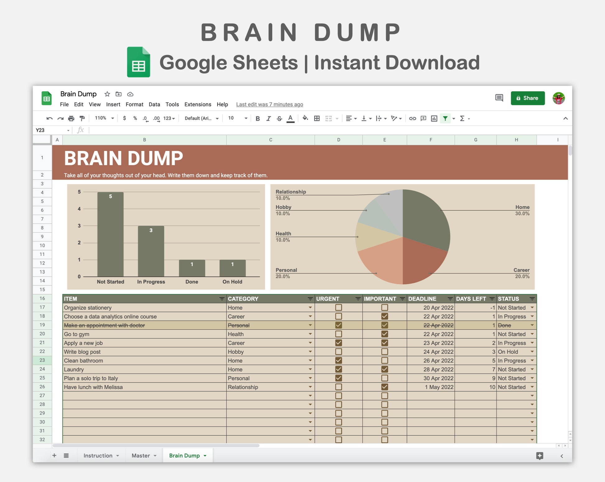 This Brain Dump Spreadsheet for Google Sheets is made in EARTHY theme in order to help you declutter your mind/ thoughts and stay organized.