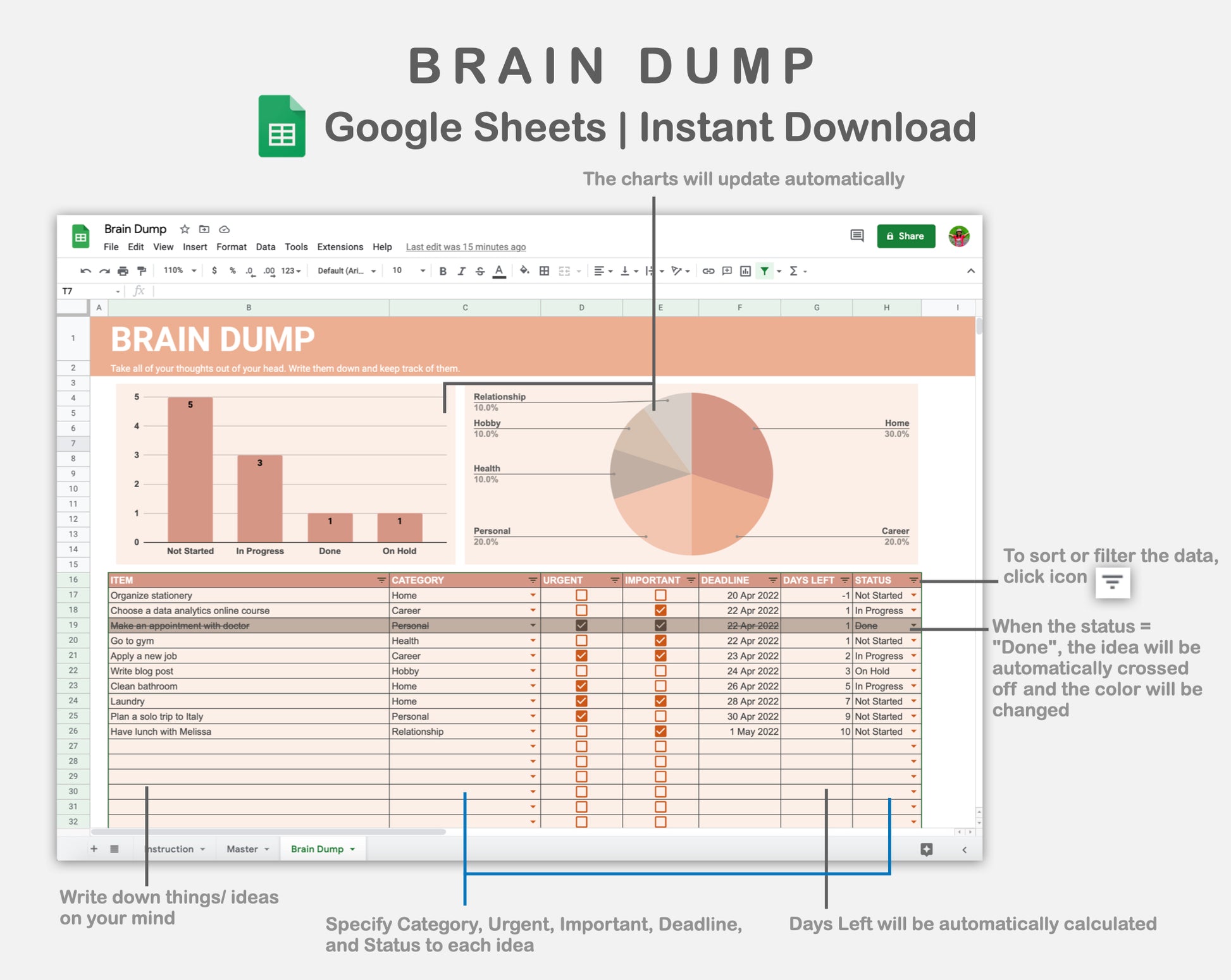 This Brain Dump Spreadsheet for Google Sheets is made in NEUTRAL theme in order to help you declutter your mind/ thoughts and stay organized.